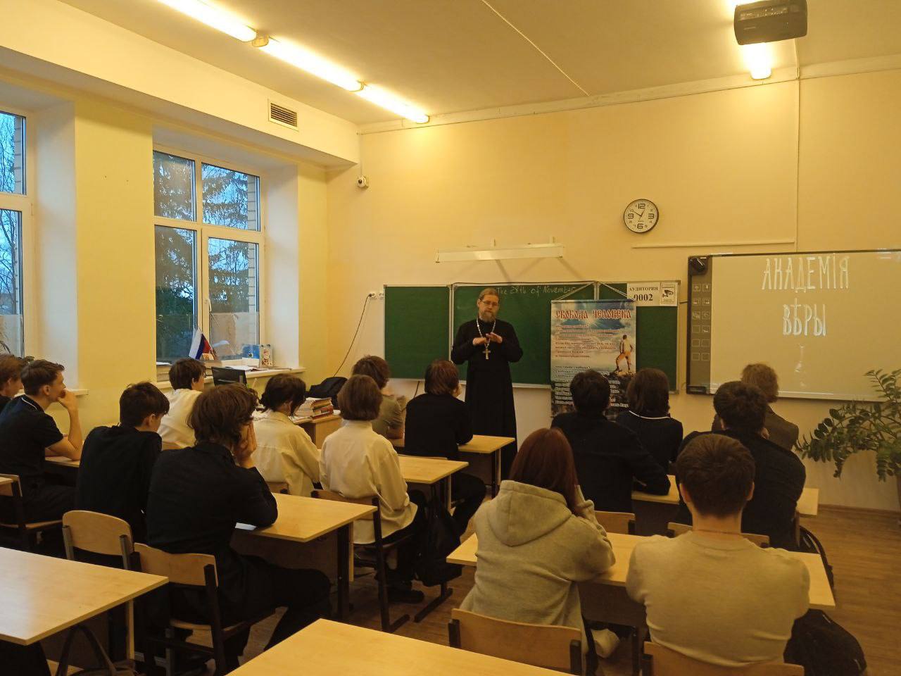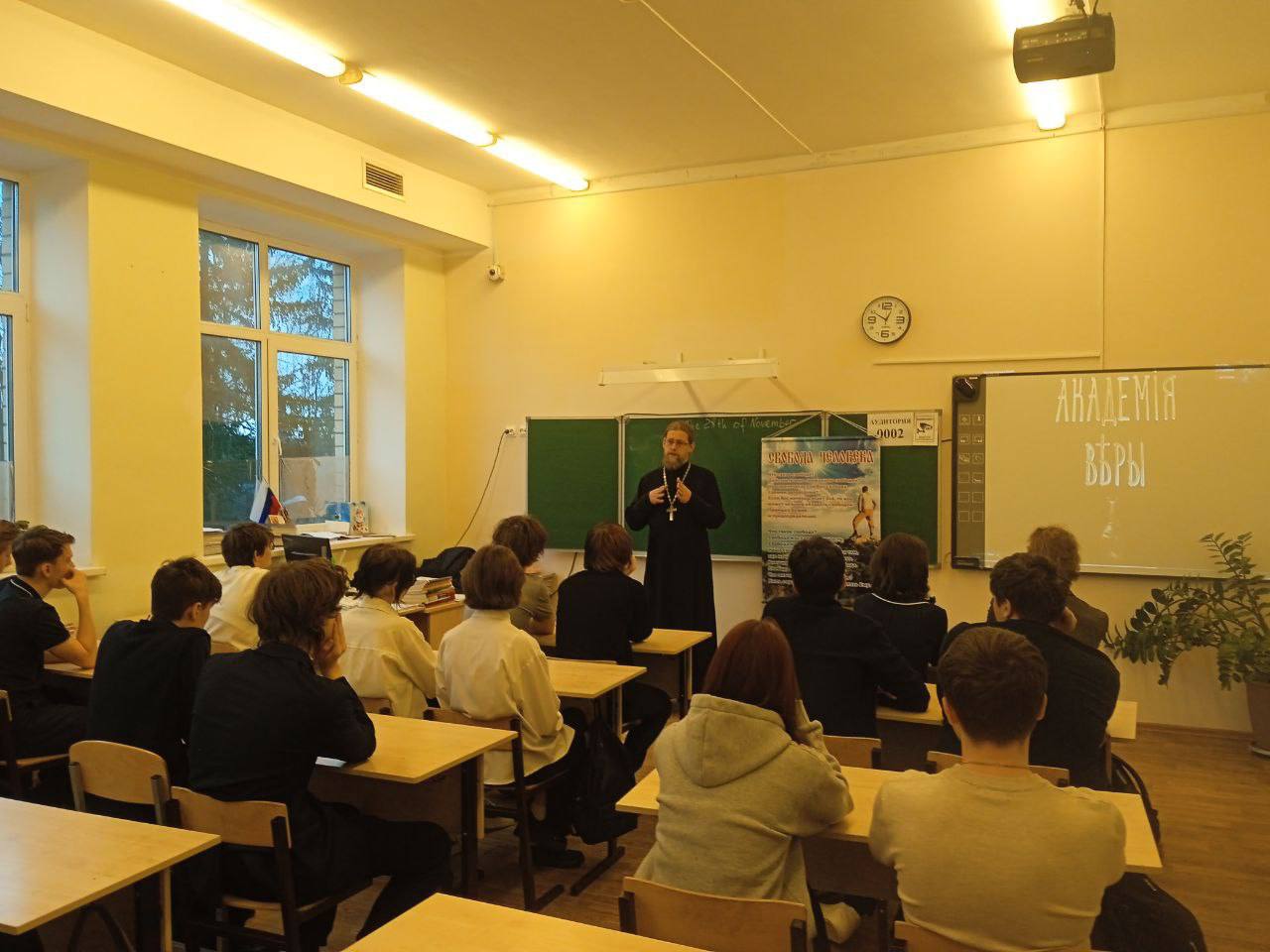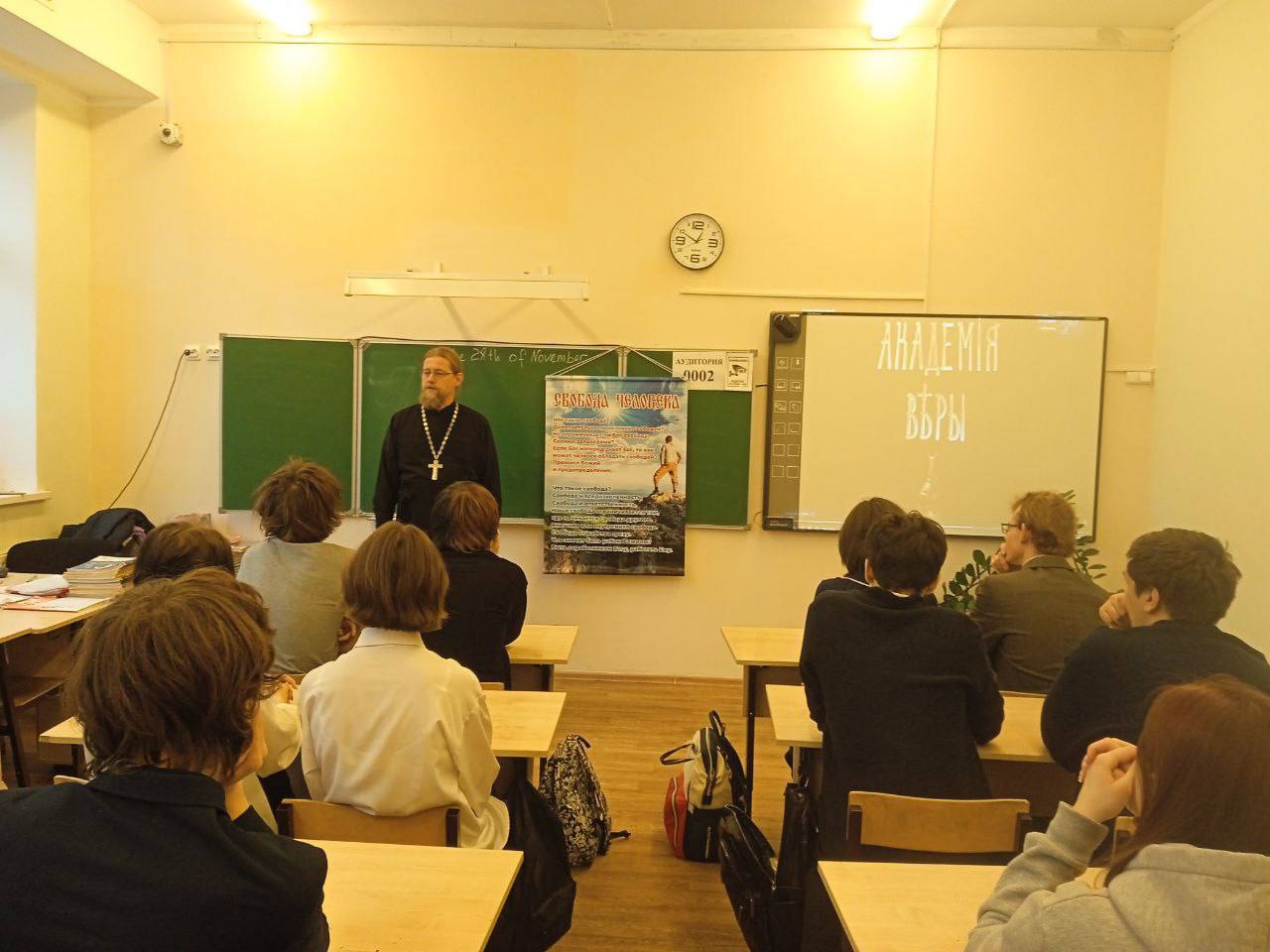 28.11.2025г. в рамках проекта "Разговор со священником" прошла встреча обучающихся 10 класса МБОУ Любучанской СОШ м.о. Чехов с Иереем Дионисием Пугачевым на тему "Свобода человека».