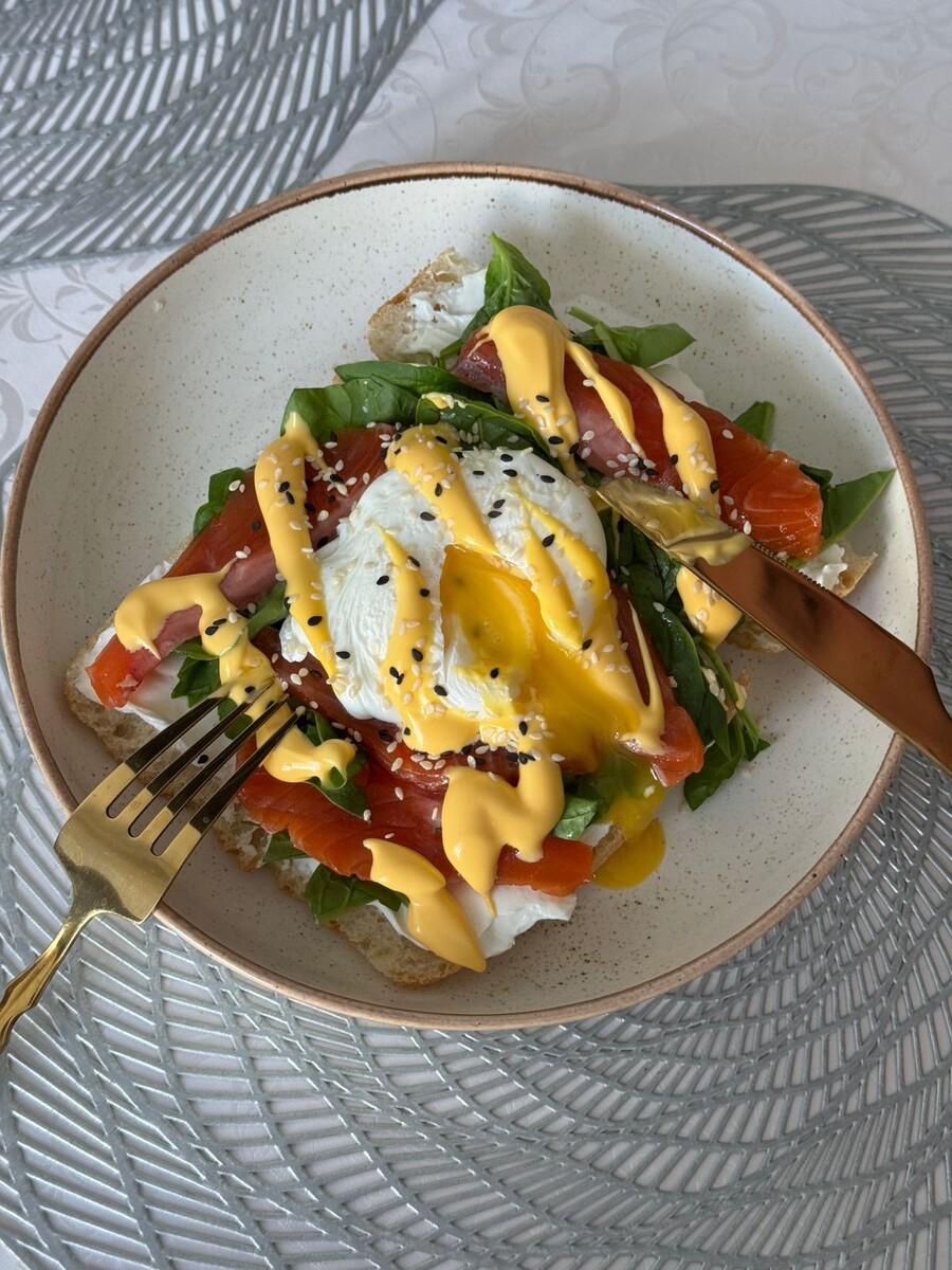 4. Соберите брускетту: На теплый ломтик хлеба намажьте творожный сыр, чтобы он слегка начал таять. Затем поочередно выкладывайте свежий шпинат, ломтики форели и аккуратно разместите яйцо пашот сверху.