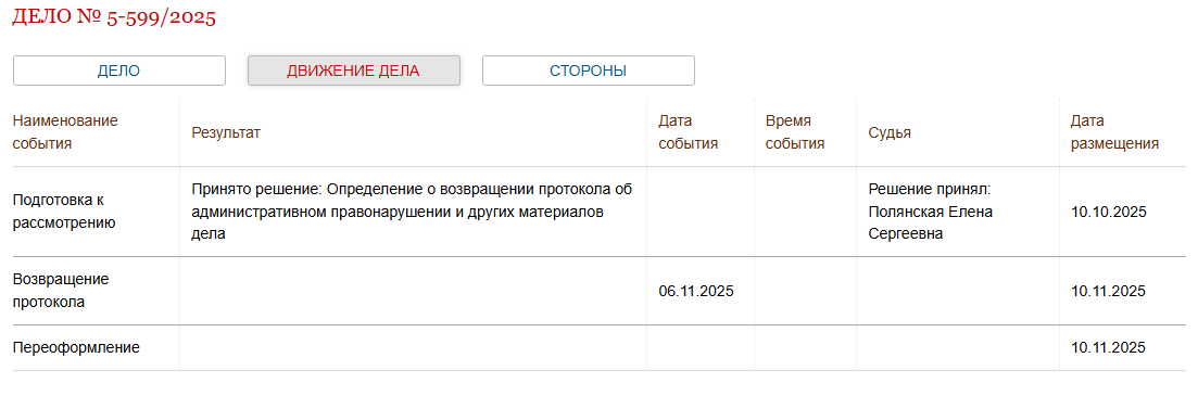 Согласно четвертой части статьи 29.4 КоАП, протокол может быть возвращён, если имеются ошибки в документации. Это не приводит к прекращению дела, а лишь дает возможность полиция исправить недостатки для повторного рассмотрения в суде.