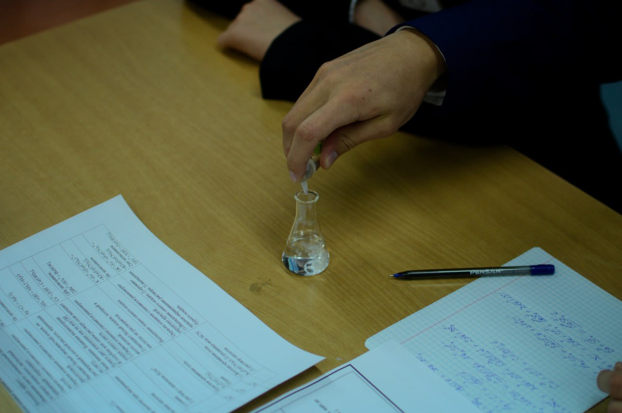 Участники определяли, в каких колбах находятся гидроксид натрия, серная кислота и вода. С помощью универсального индикатора и химических реакций они опытным путём установили состав каждого раствора.
