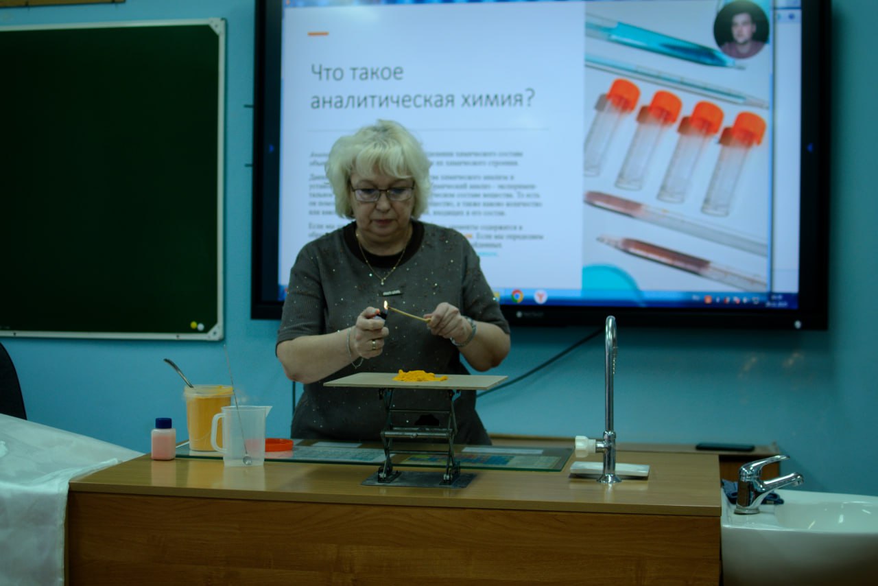 На станции «ХИМИКИ-АНАЛИТИКИ» участники квеста под руководством учителя химии Елены Викторовны Бовкунович погрузились в мир аналитической химии — науки, которая отвечает на вопросы «Что это за вещество?» и «Сколько