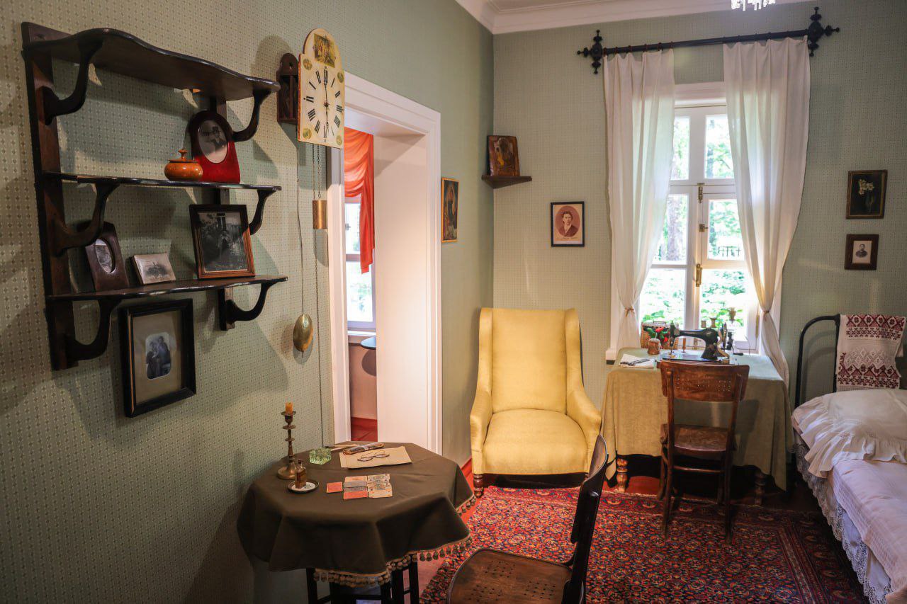 Любимым развлечением Евгении Яковлевны был пасьянс, который она раскладывала в своей комнате, устав от забот дня. Несколько карт на столе — мемориальные предметы, принадлежавшие Евгении Яковлевне.