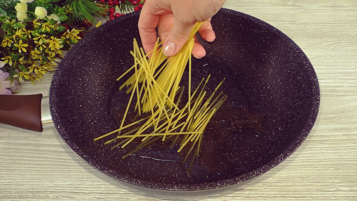 Для приготовления спагетти их следует сначала поломать на три части. В глубокую сковороду с толстым дном налить немного растительного масла и включить плиту на сильный огонь.