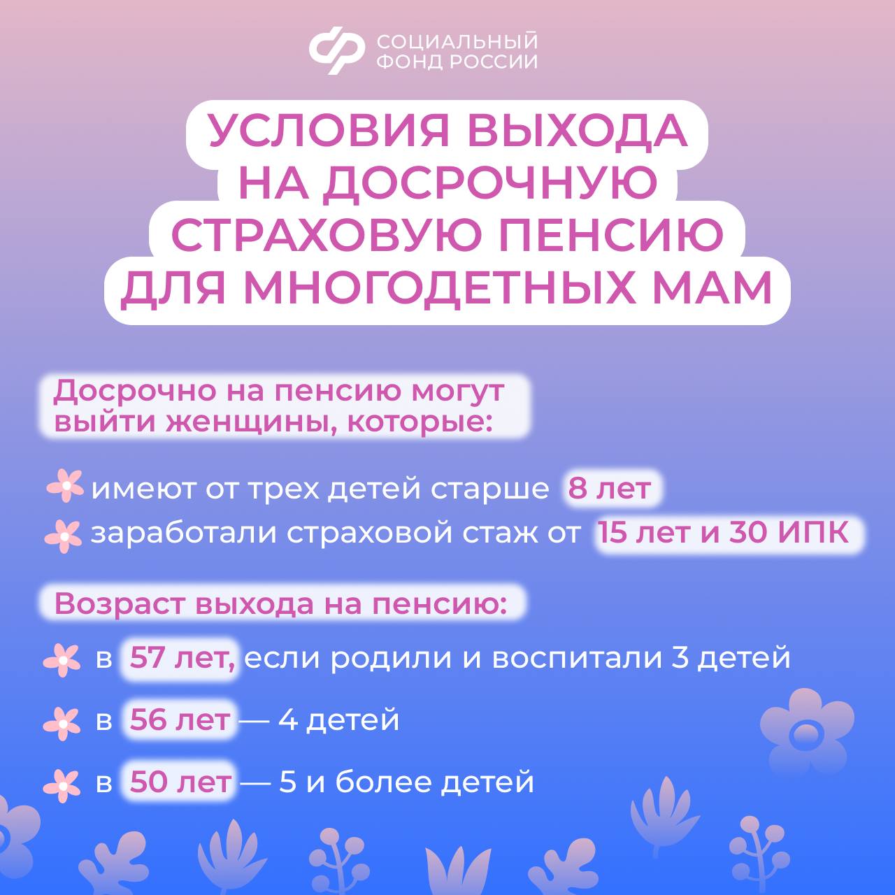 Женщины, которые родили и воспитали от трех детей до достижения ими 8 лет и заработали страховой стаж от 15 лет и 30 ИПК, имеют право на досрочный выход на пенсию.