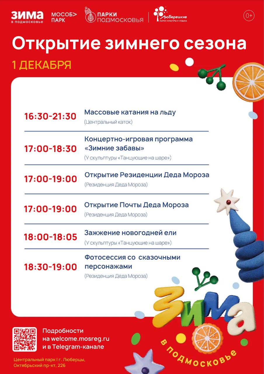 В 17:30 на главном входе в парк в лесопарке «Лесная опушка» состоится концертно-развлекательная программа «Здравствуй, зима!». В 18:00 торжественно зажжется новогодняя ель.
