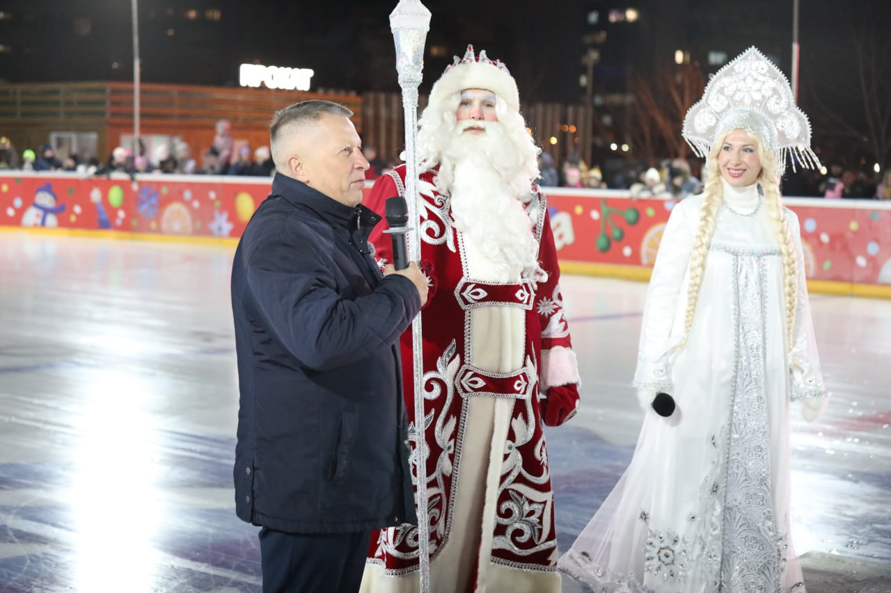 В 17.00 под традиционное «Раз-два-три, ёлочка, гори!» зажглись гирлянды на ёлке в Центральном парке и стартовало первое ледовое шоу на новом современном катке.