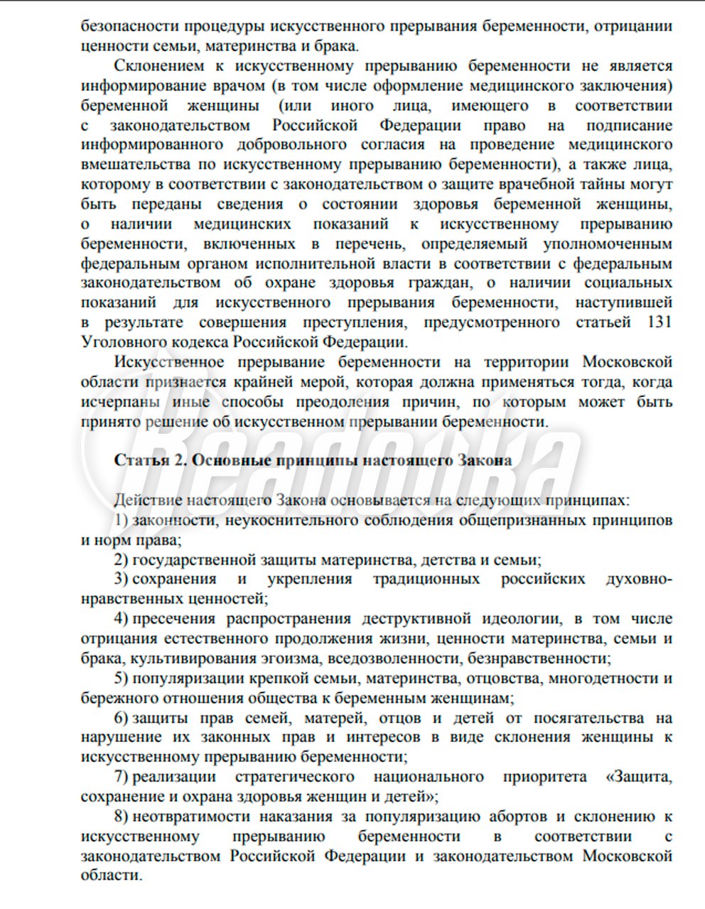 В Мособлдуму внесли законопроект, запрещающий склонение к абортам. В документе искусственное прерывание беременности хотят признать крайней мерой, которая должна применяться в случае отсутствия других методов влияния на женщину. Под склонением предлагается понимать «изменение воли женщины с намерением вызвать в ней желание сделать аборт» — от уговоров и подкупа до «отрицания ценности семьи, материнства и брака».