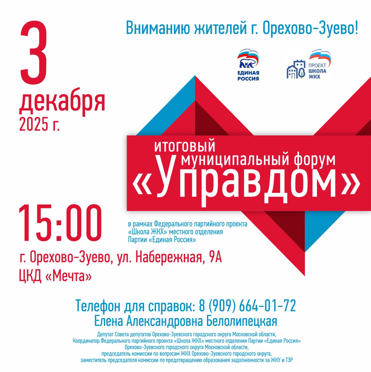 Напоминаем, муниципальный форум «Управдом» состоится завтра, 3 декабря, в 15:00 по адресу: г. Орехово-Зуево, ул. Набережная, 9А, ЦКД «Мечта»