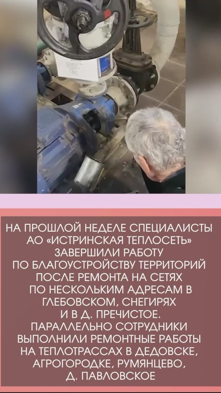 Глебовском, Снегирях и в д. Пречистое. Параллельно сотрудники выполнили ремонтные работы на теплотрассах в Дедовске, Агрогородке, Румянцево, д. Павловское.