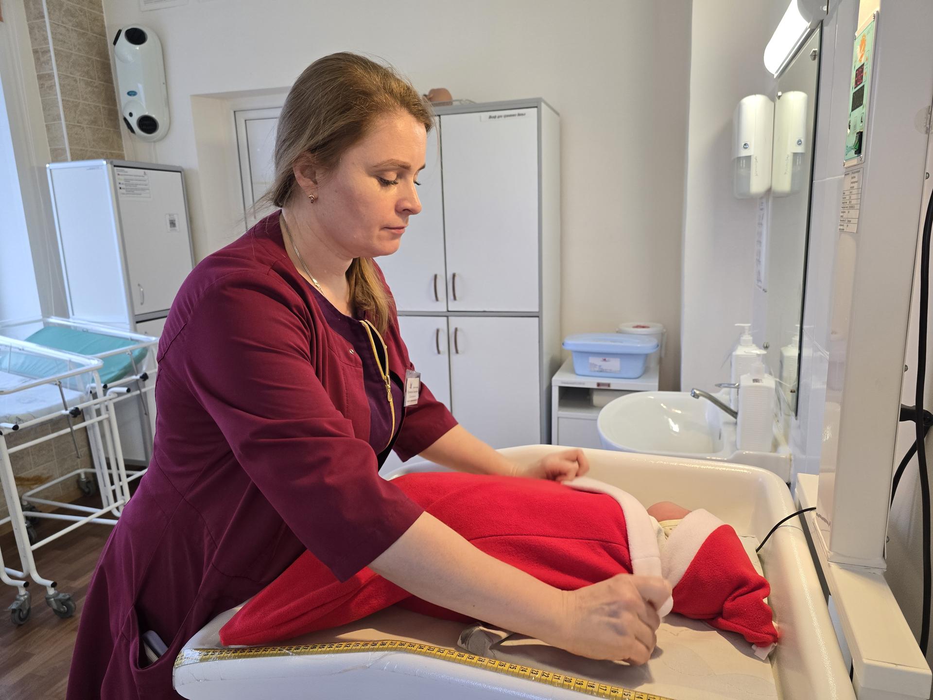 В родильном зале мамы встречают «декабрят» в праздничных колпачках и конвертах. 1 декабря первыми примерили наряды две девочки, появившиеся на свет ночью и рано утром.