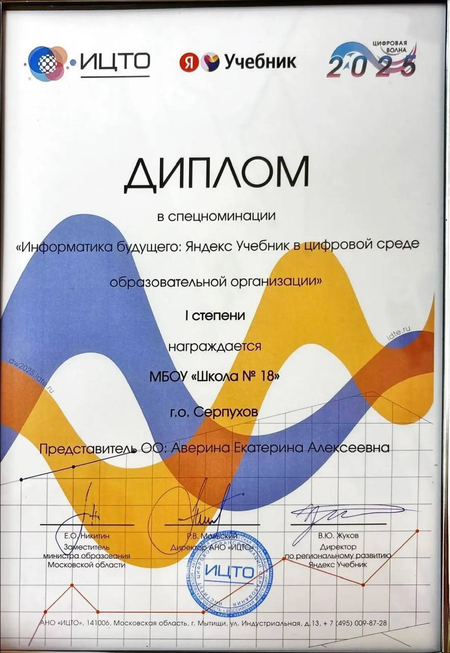 Поздравляем учительницу информатики школы №18, с первой степенью в номинации «Информатика будущего: Яндекс Учебник в цифровой среде образовательной организации».