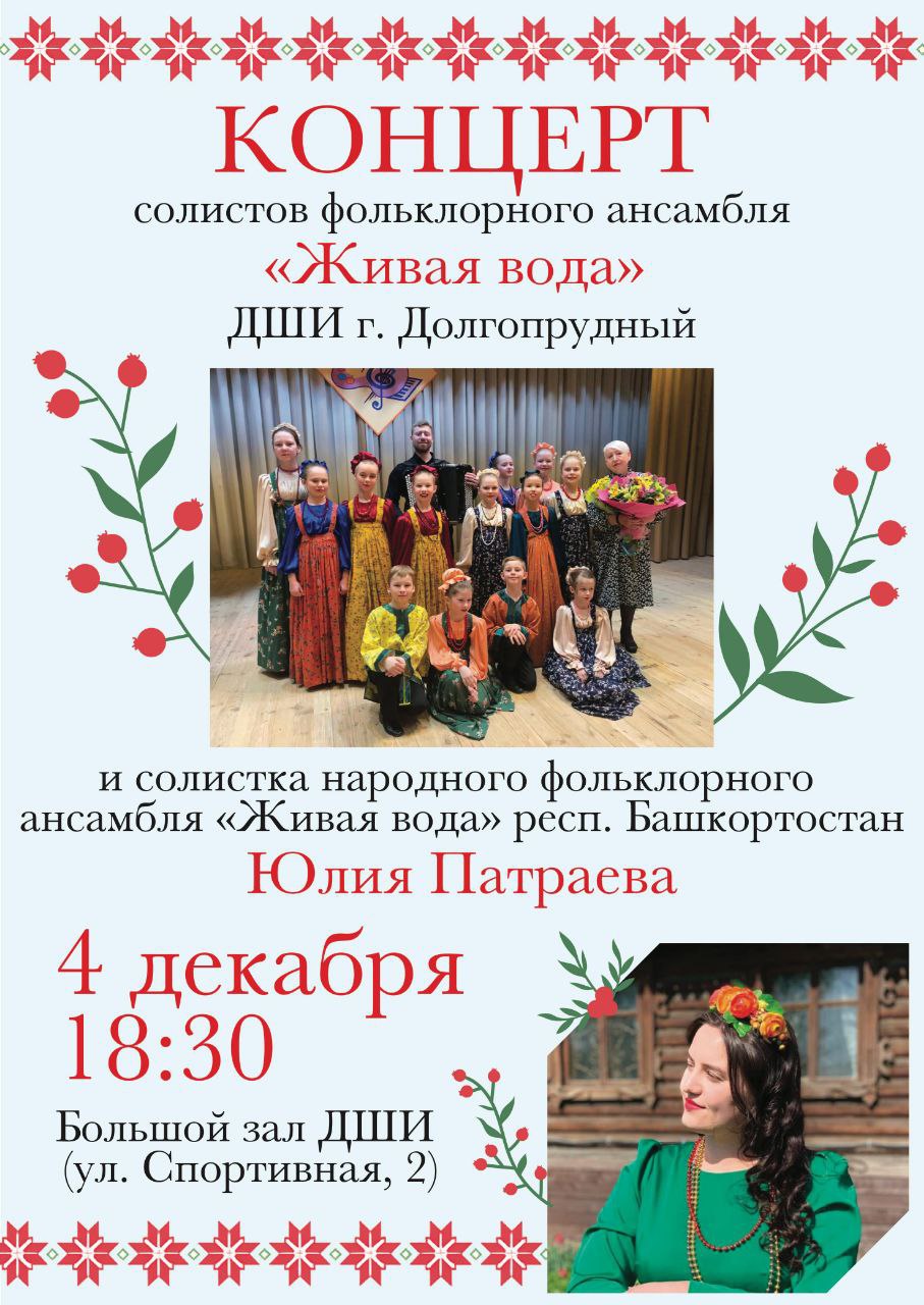 С удовольствием напоминаем, что завтра, 4 декабря, в Большом зале нашей школы состоится концерт сразу двух фольклорных ансамблей «Живая вода»! Один из них — хорошо известный и любимый фольклорный ансамбль воспитанников нашей школы, а второй представит солистка его полного тезки из Башкирии Юлия Патраева.