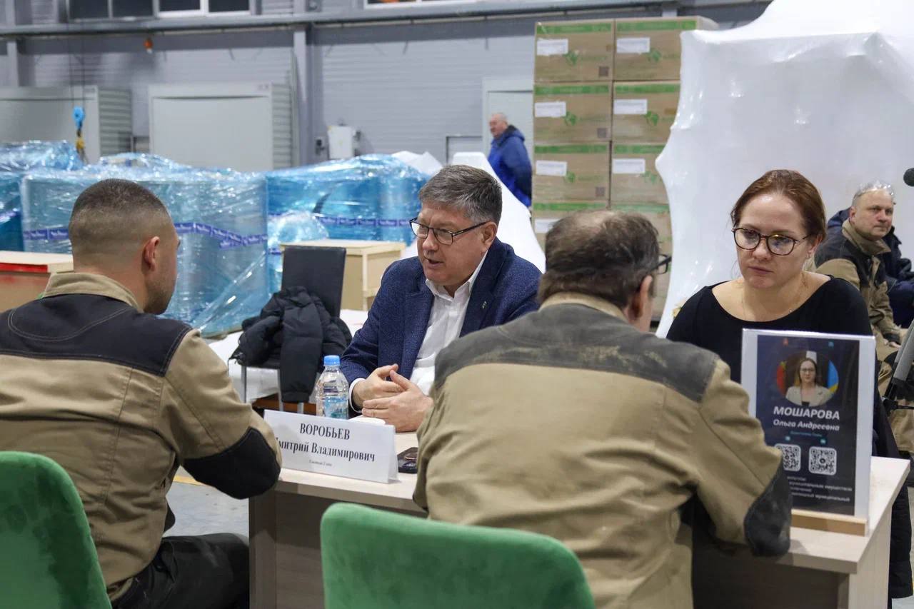 Более 400 человек работает, здесь хорошие условия труда, плотный график, поэтому далеко не все сотрудники могут приехать за консультацией в администрацию в рабочее время. Приехали мы, вместе с заместителями и начальниками управления приняли около 14 сотрудников и получили около 20 персональных вопросов.