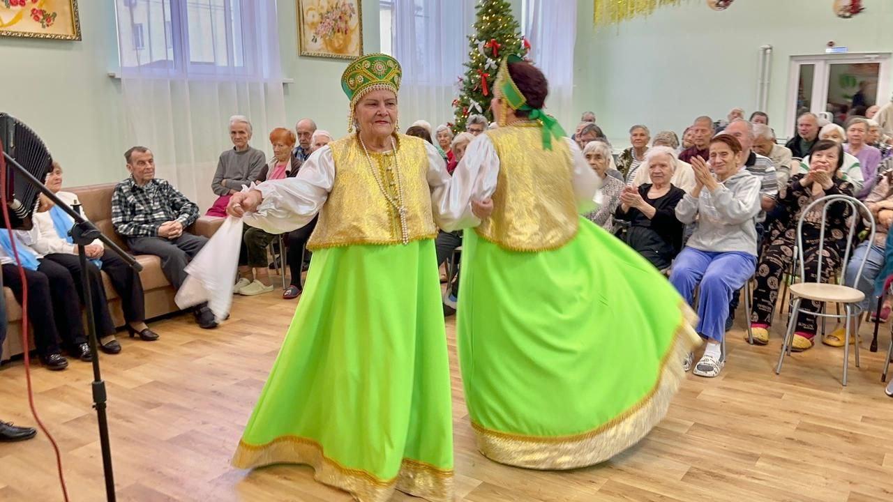 Программа концерта включала исполнение песен и чтение стихотворений. Зрители активно поддерживали выступающих аплодисментами, некоторые присоединились к танцам. Участники мероприятия также подготовили подарки для постояльцев пансионата.