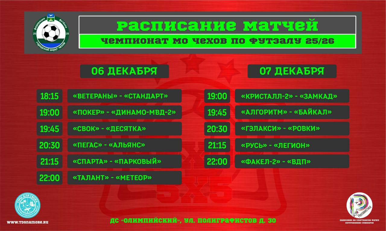 Расписание матчей Чемпионата муниципального округа Чехов по футзалу сезона 2025/2026, которые пройдут в субботу и воскресенье