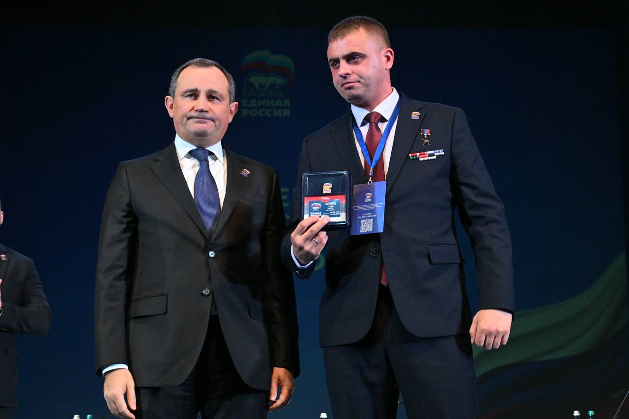 На Конференции подмосковной «Единой России» вручил партийные билеты героям специальной военной операции Ивану Клещерёву, Кириллу Соснину и Андрею Яковлеву
