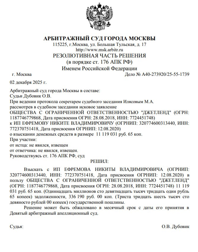 Суд взыскал 11 млн рублей с блогера Никиты Ефремова*.