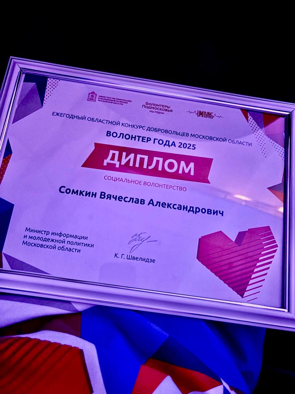 Участник Чеховского клуба волонтеров Вячеслав Сомкин стал победителем регионального конкурса добровольцев Подмосковья «Волонтер года – 2025» в номинации «Социальное Волонтерство»