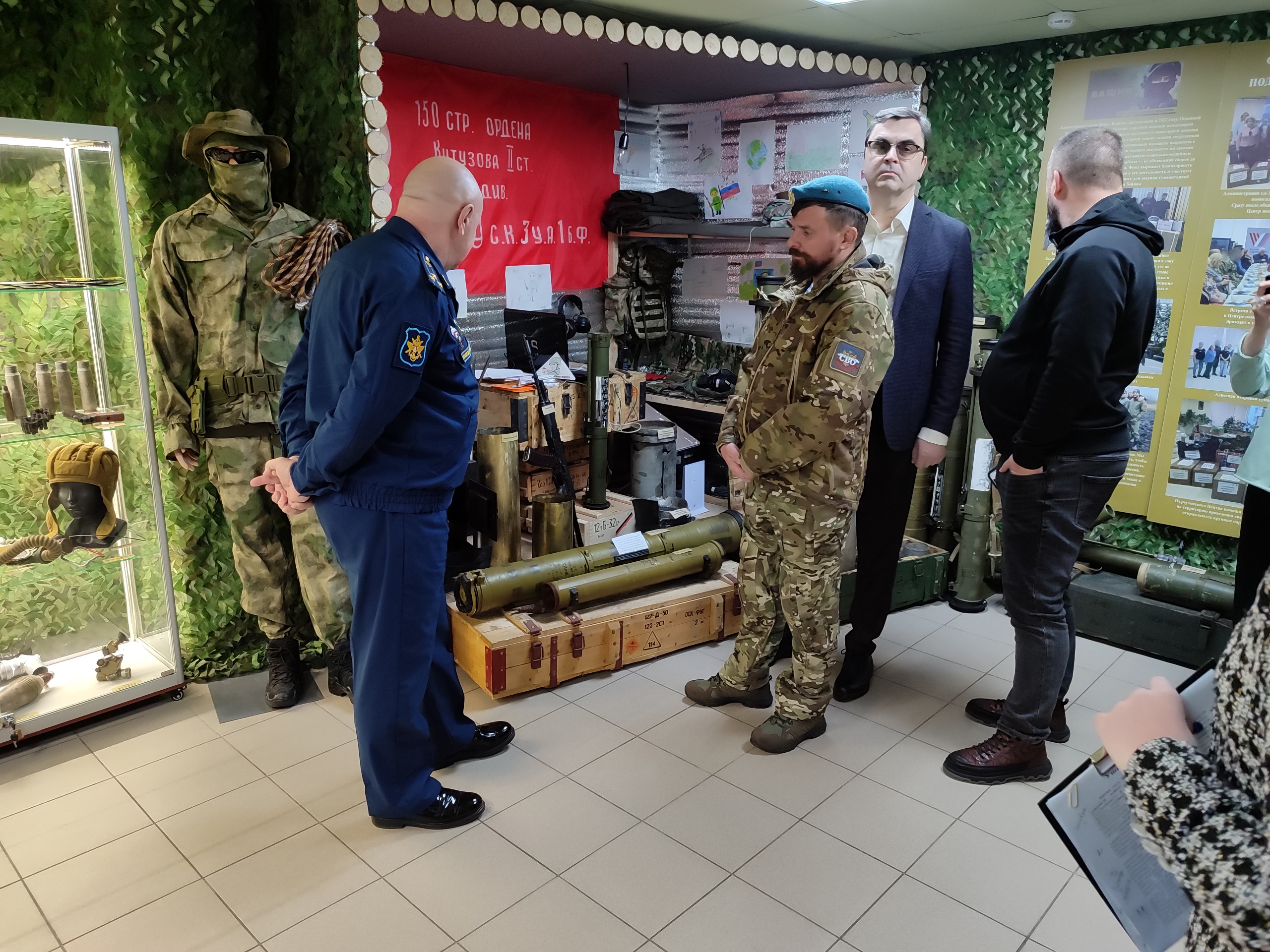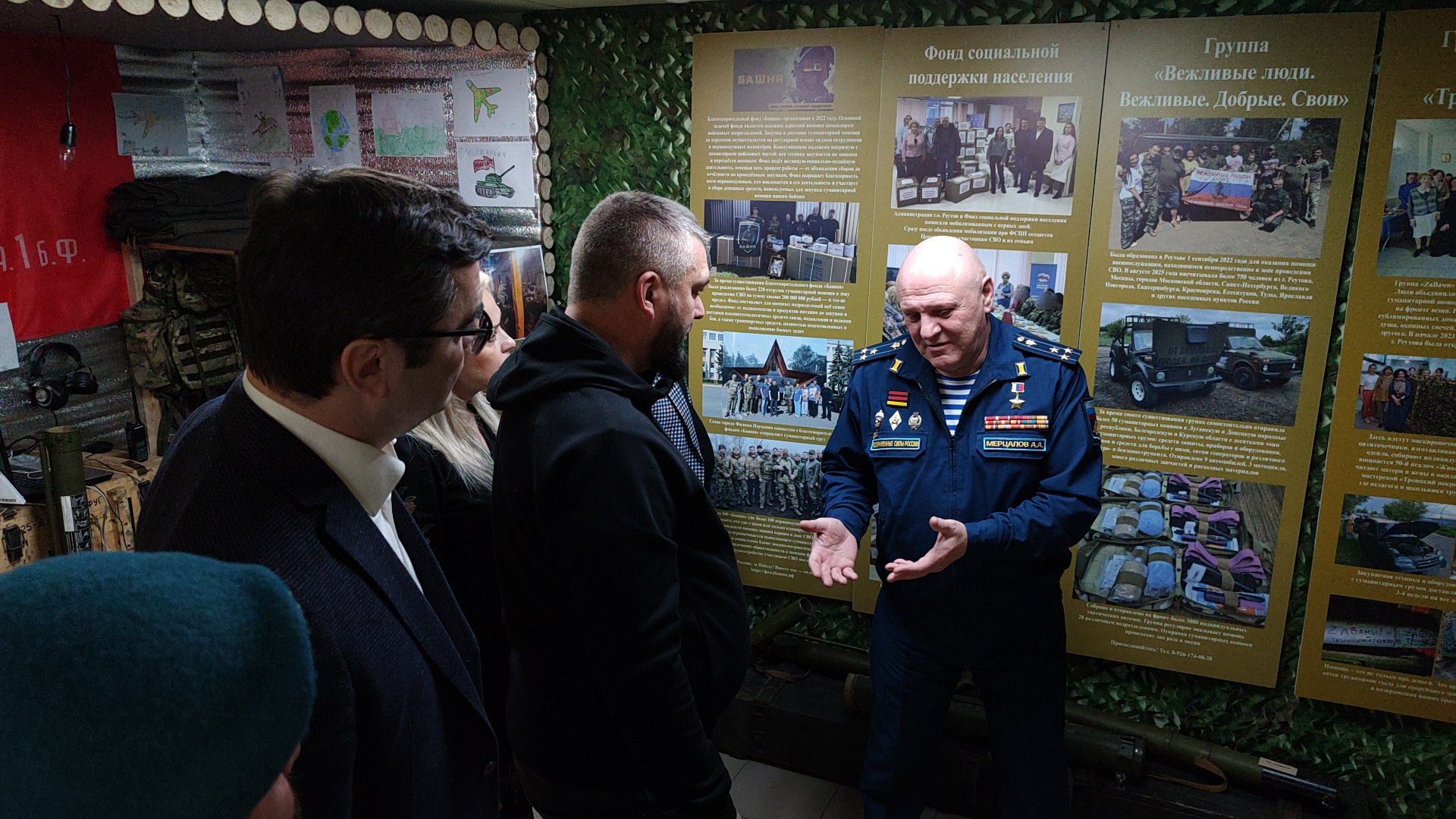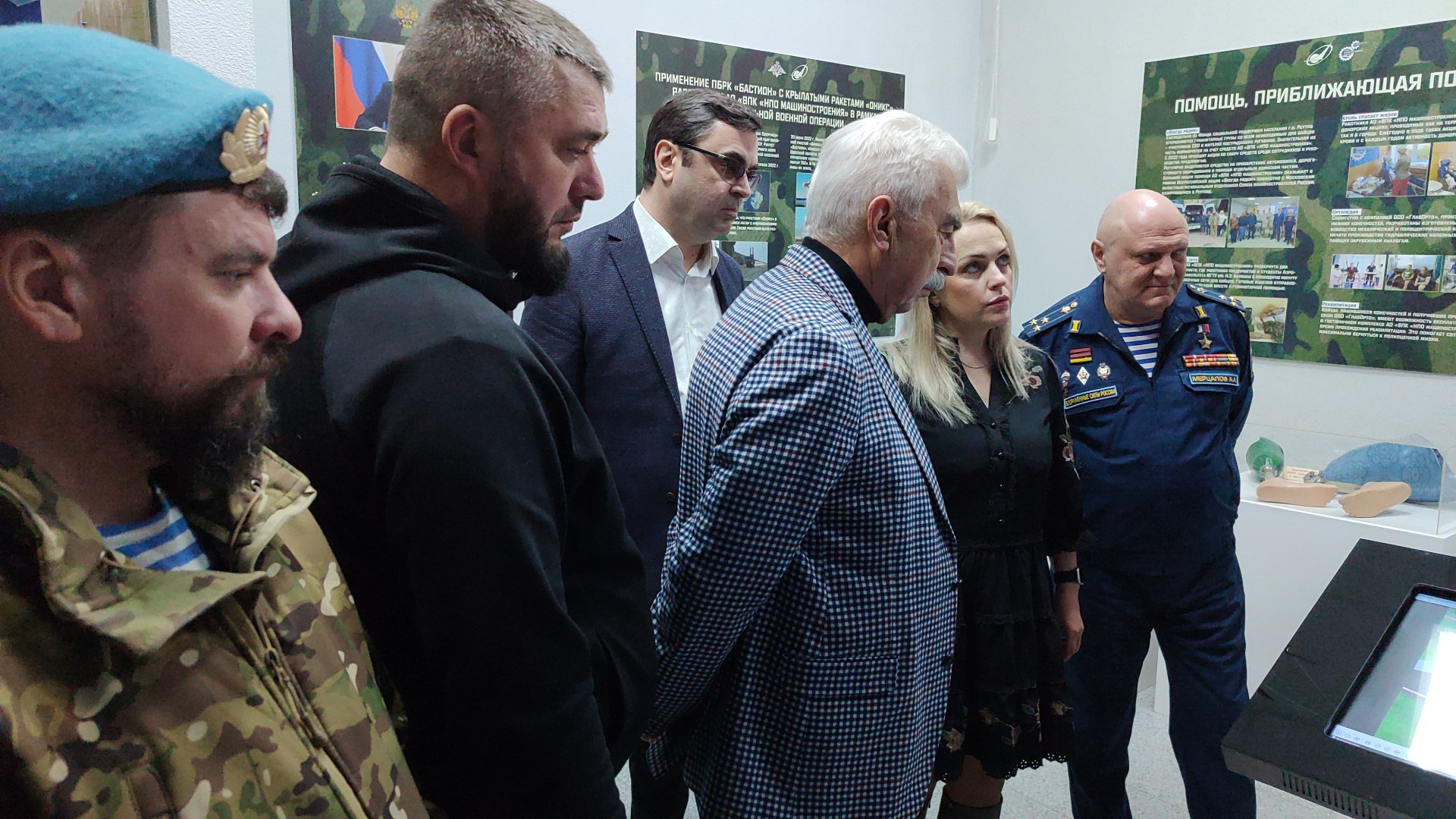 В ходе экскурсии Герой России, председатель Комитета по делам ветеранов и патриотическому воспитанию городского Совета депутатов Андрей Мерцалов рассказал о том, как выставка пополнялась предметами быта бойцов и трофеями вражеской техники. Особое внимание обратили на тяжёлый 20-килограммовый бронежилет, который ежедневно носят военнослужащие в зоне проведения СВО.