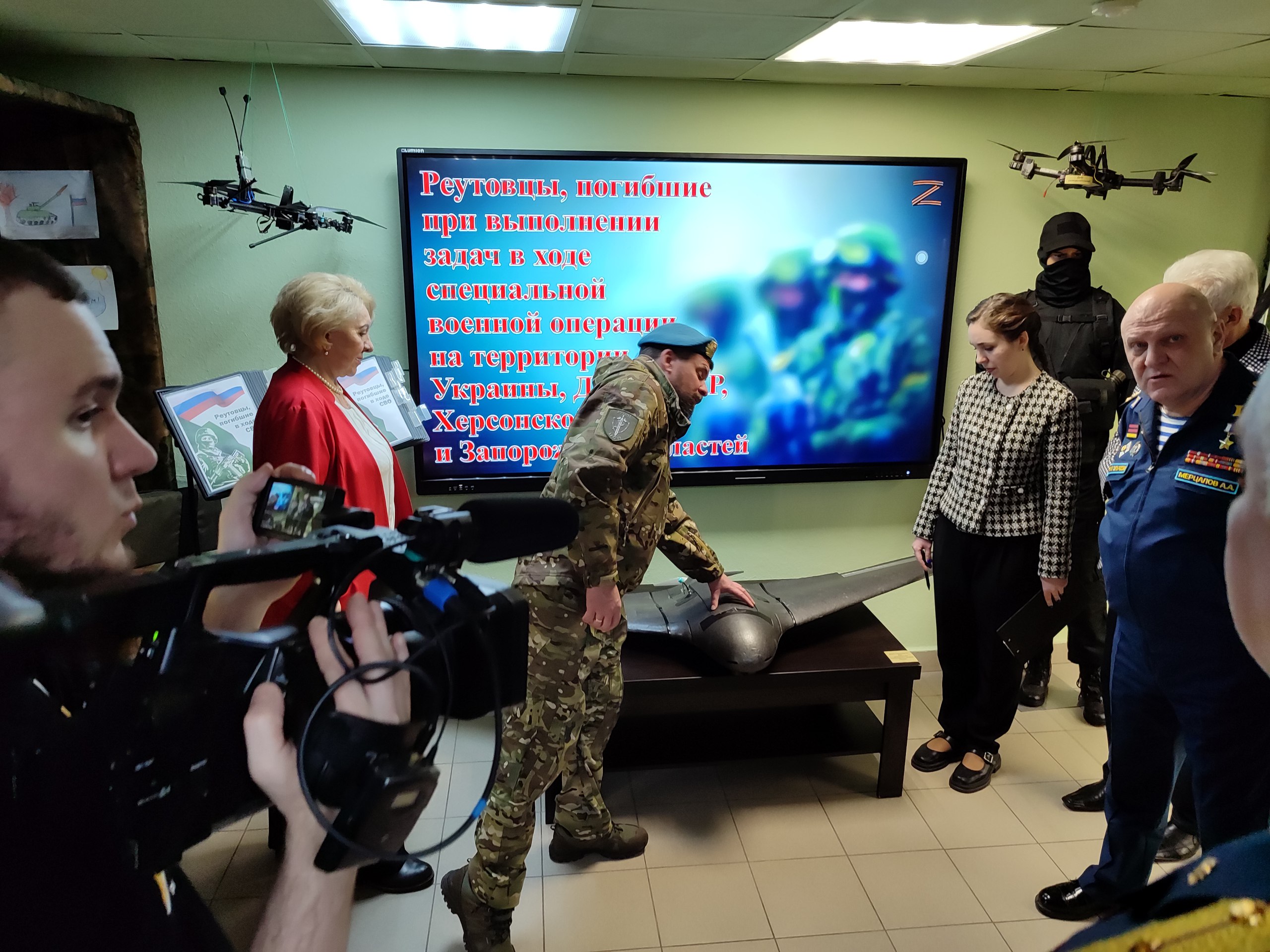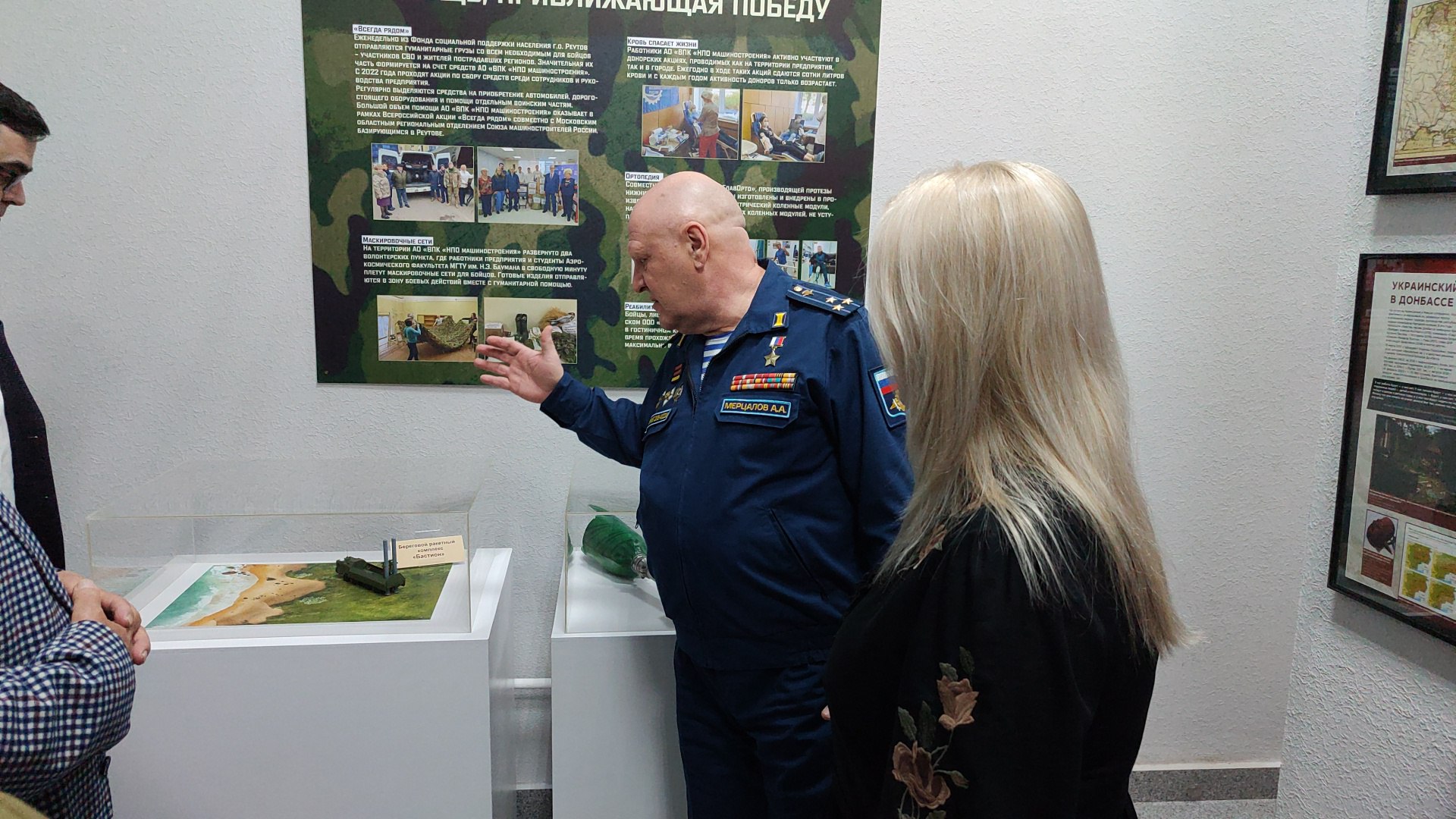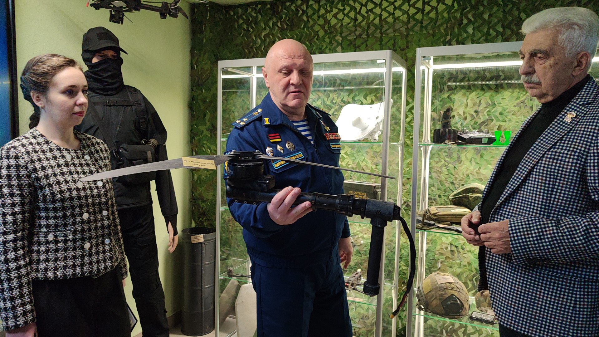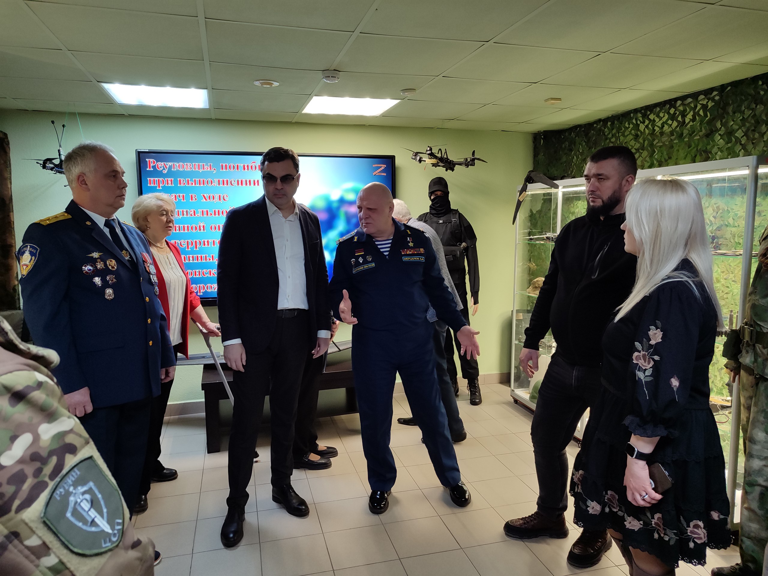В ходе экскурсии Герой России, председатель Комитета по делам ветеранов и патриотическому воспитанию городского Совета депутатов Андрей Мерцалов рассказал о том, как выставка пополнялась предметами быта бойцов и трофеями вражеской техники. Особое внимание обратили на тяжёлый 20-килограммовый бронежилет, который ежедневно носят военнослужащие в зоне проведения СВО.