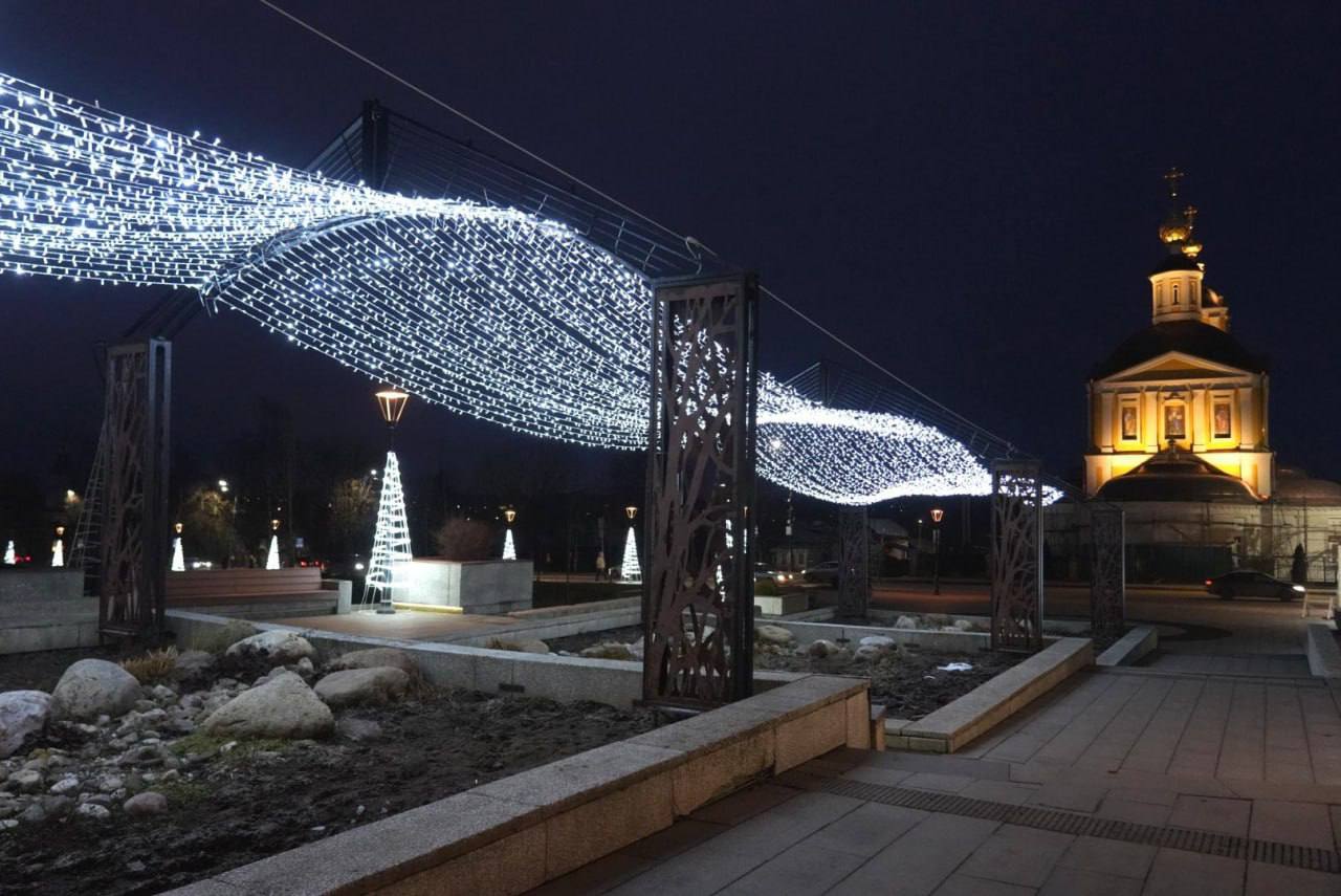 Преобразилась и пешеходная зона «Дорога к храму». К празднику здесь вновь оформили светильники в форме новогодних ёлок, сделали подсветку легендарного дуба и подвесили световой шатёр.