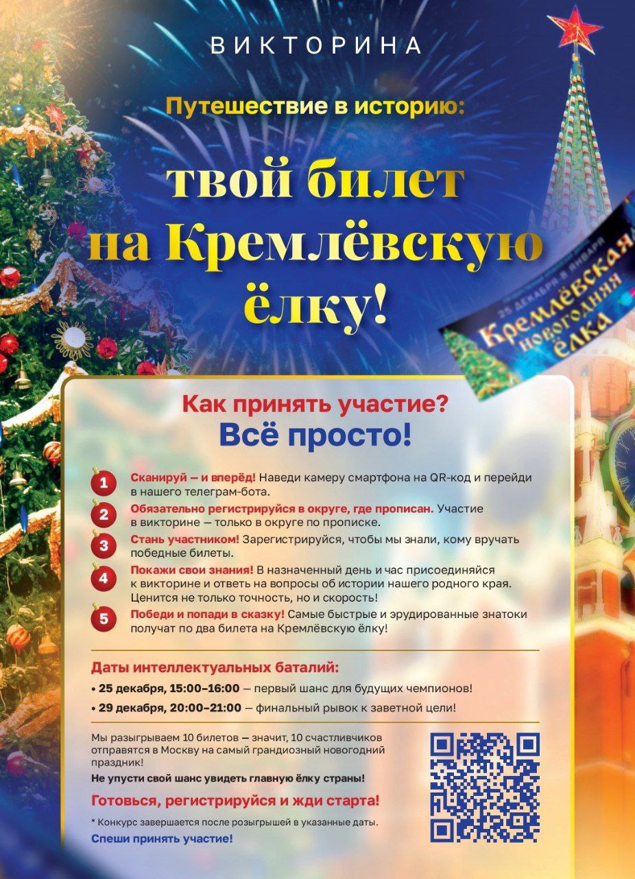 Разыгрывается 10 призовых пакетов.Каждый победитель получит 2 билета на новогоднее представление у Кремлёвской ёлки в Москве.