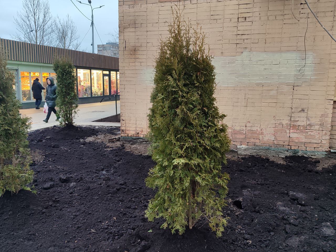 В Реутове продолжается комплексная работа по благоустройству общественных пространств. В рамках данных мероприятий на улице Южной, д. 2, на территории, освобожденной после сноса нестационарных торговых объектов, проводится высадка деревьев. В настоящее время осуществляется посадка девяти туй.