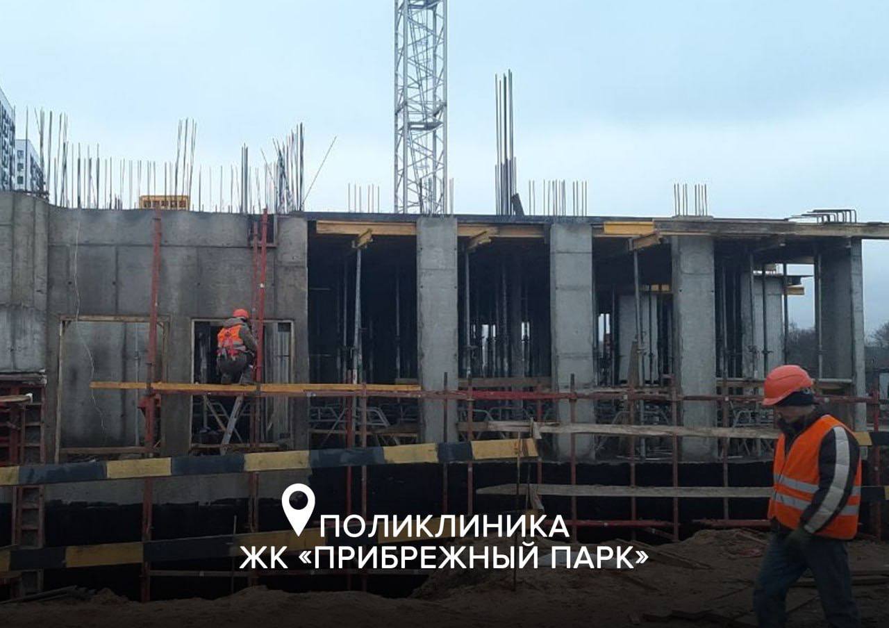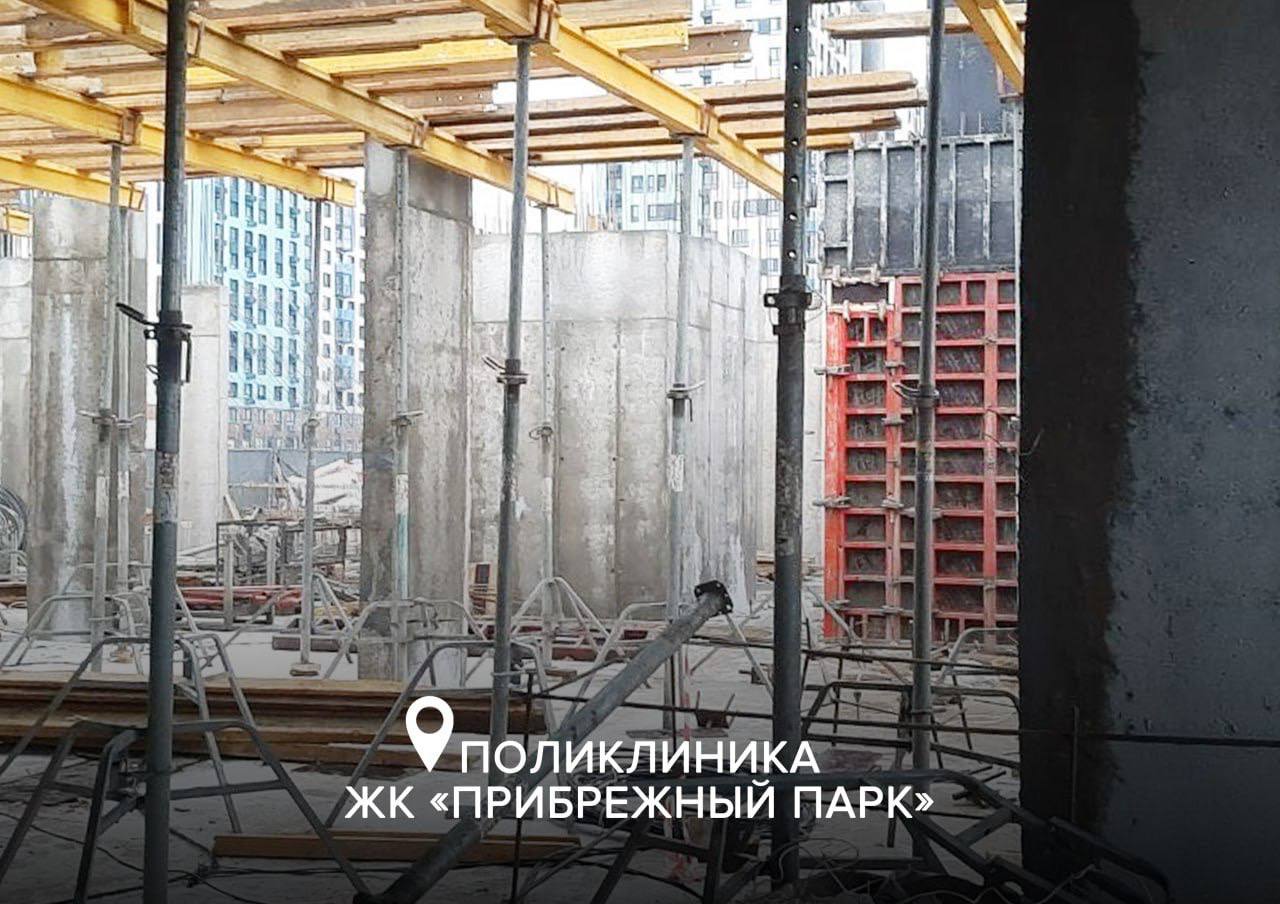 Рядом строится поликлиника на 216 посещений в смену. Всё идёт по графику: ведутся монолитные работы по устройству каркаса будущего здания, уже сделан подвал, проводится монтаж первого этажа. Срок ввода – 2027 год.