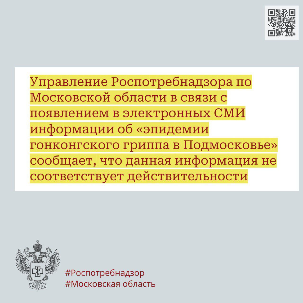 Управление Роспотребнадзора по Московской области в связи с появлением в электронных СМИ информации об «эпидемии гонконгского гриппа в Подмосковье» сообщает, что данная информация не соответствует действительности.