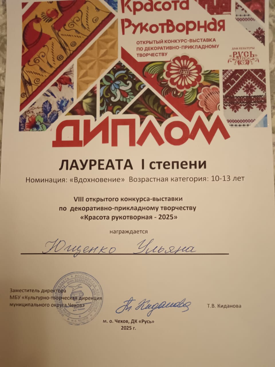 Наши новости. Участие в VIII Открытом конкурсе-выставке по декоративно-прикладному творчеству «Красота рукотворная 2025» в ДК «Русь» м.о. Чехов