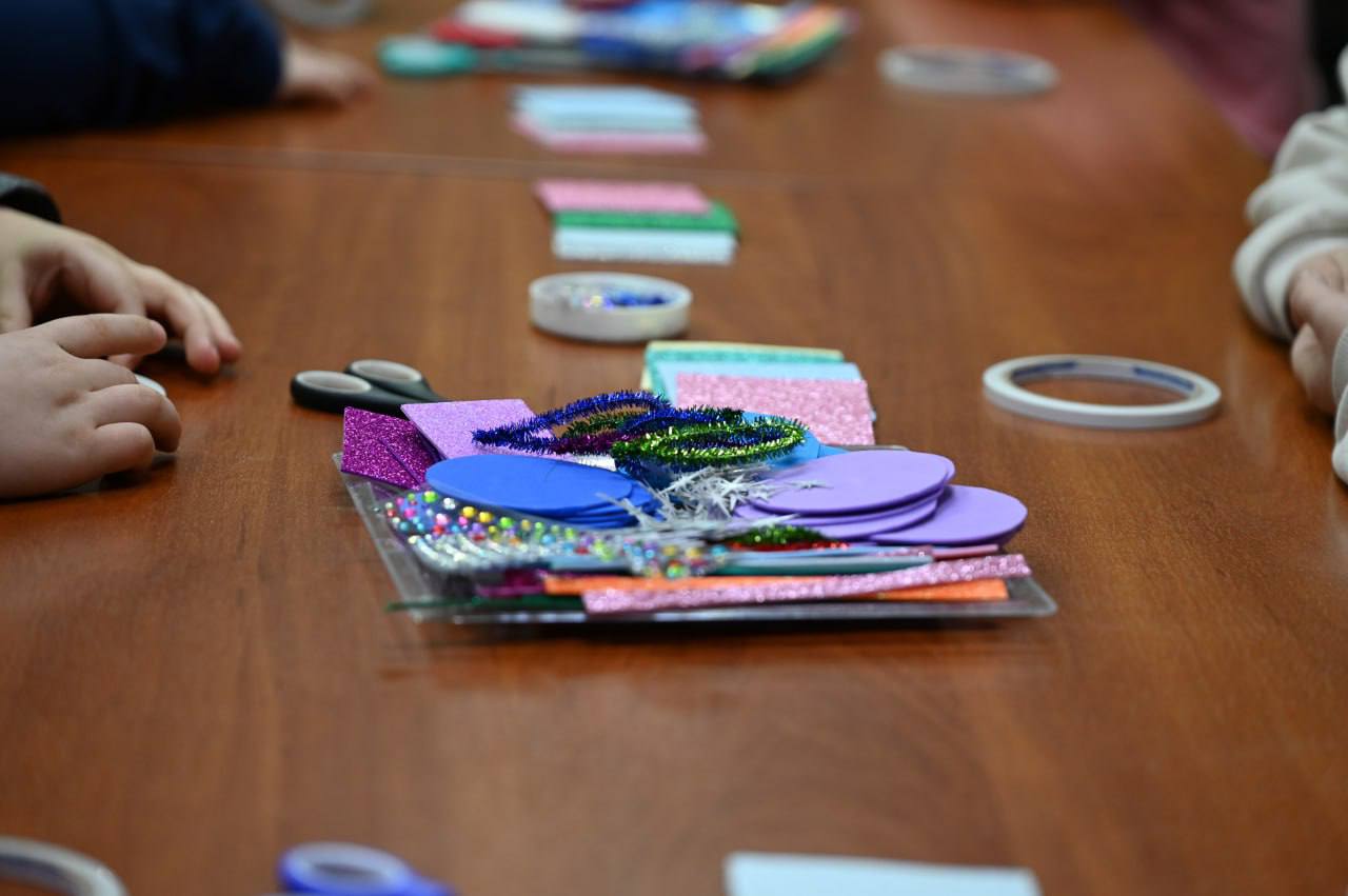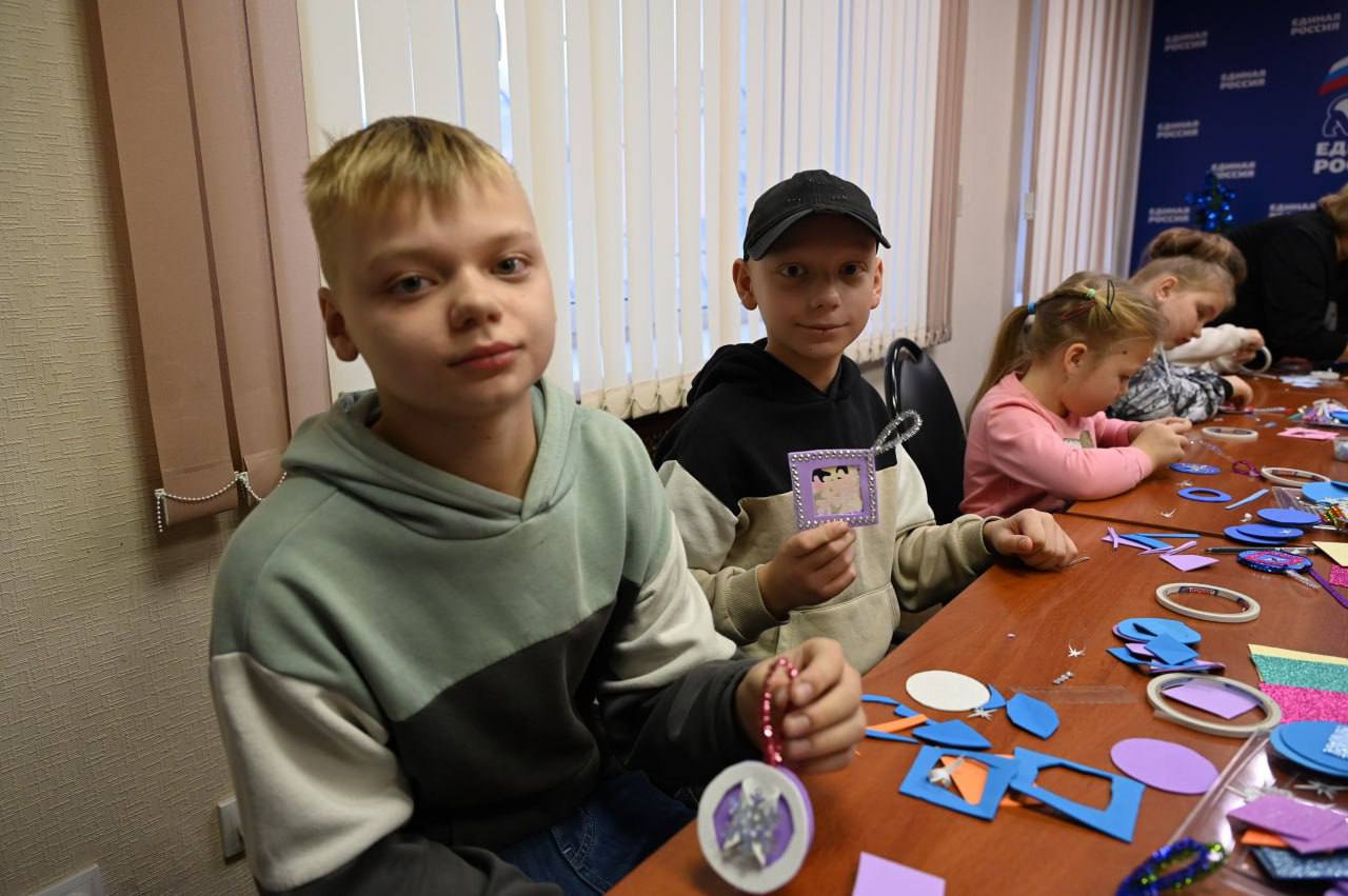 Здесь состоялся увлекательный мастер-класс по изготовлению новогодних украшений для детей из семей участников СВО, а также для всех желающих ребят.