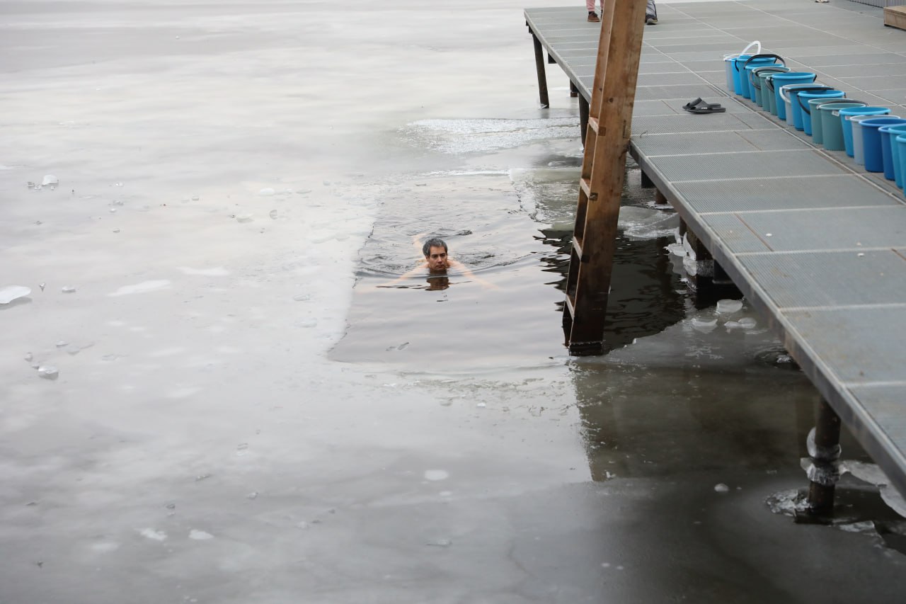 После разминки моржи приступили к обливанию, в три счёта окатив себя ведром ледяной воды. Самые продвинутые в вопросах закаливания продолжили водные процедуры в проруби залива.