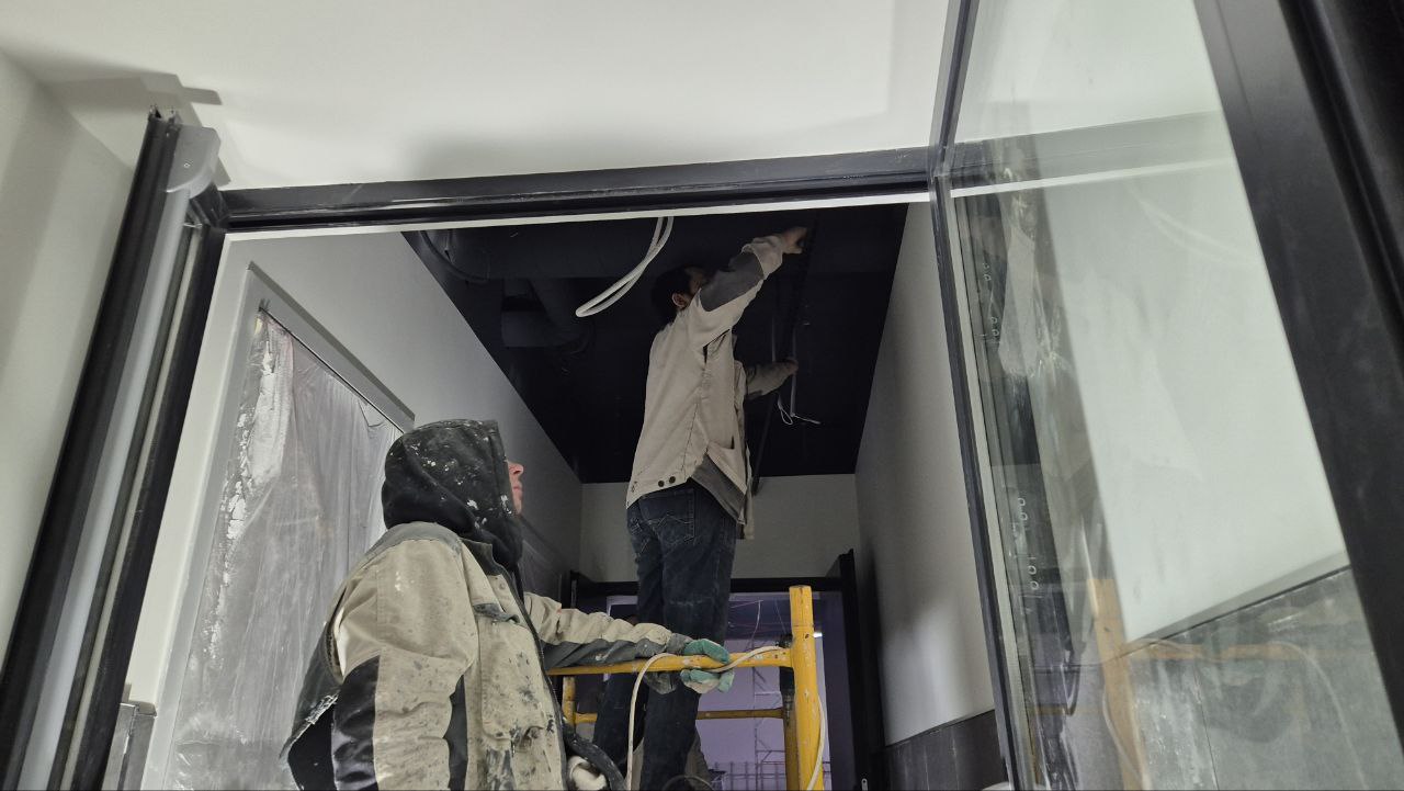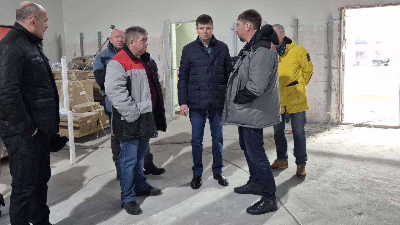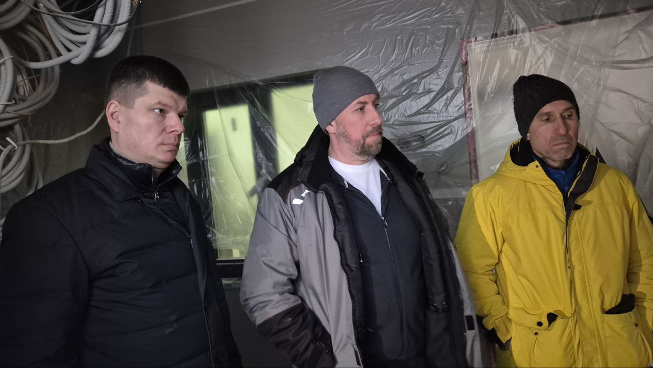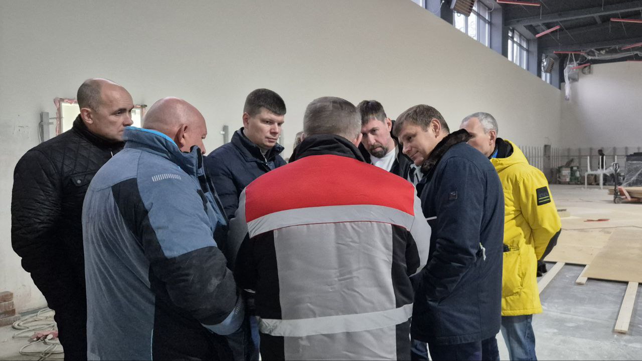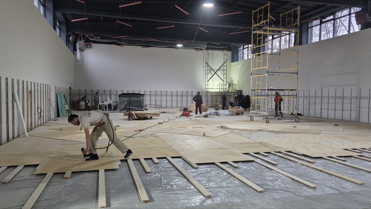 Подрядчик увеличил количество рабочих на объекте: проводит монтаж основания под укладку паркетной доски, завершает отделочные работы. Также ведётся работа по запуску системы отопления и освещения спортивного зала.