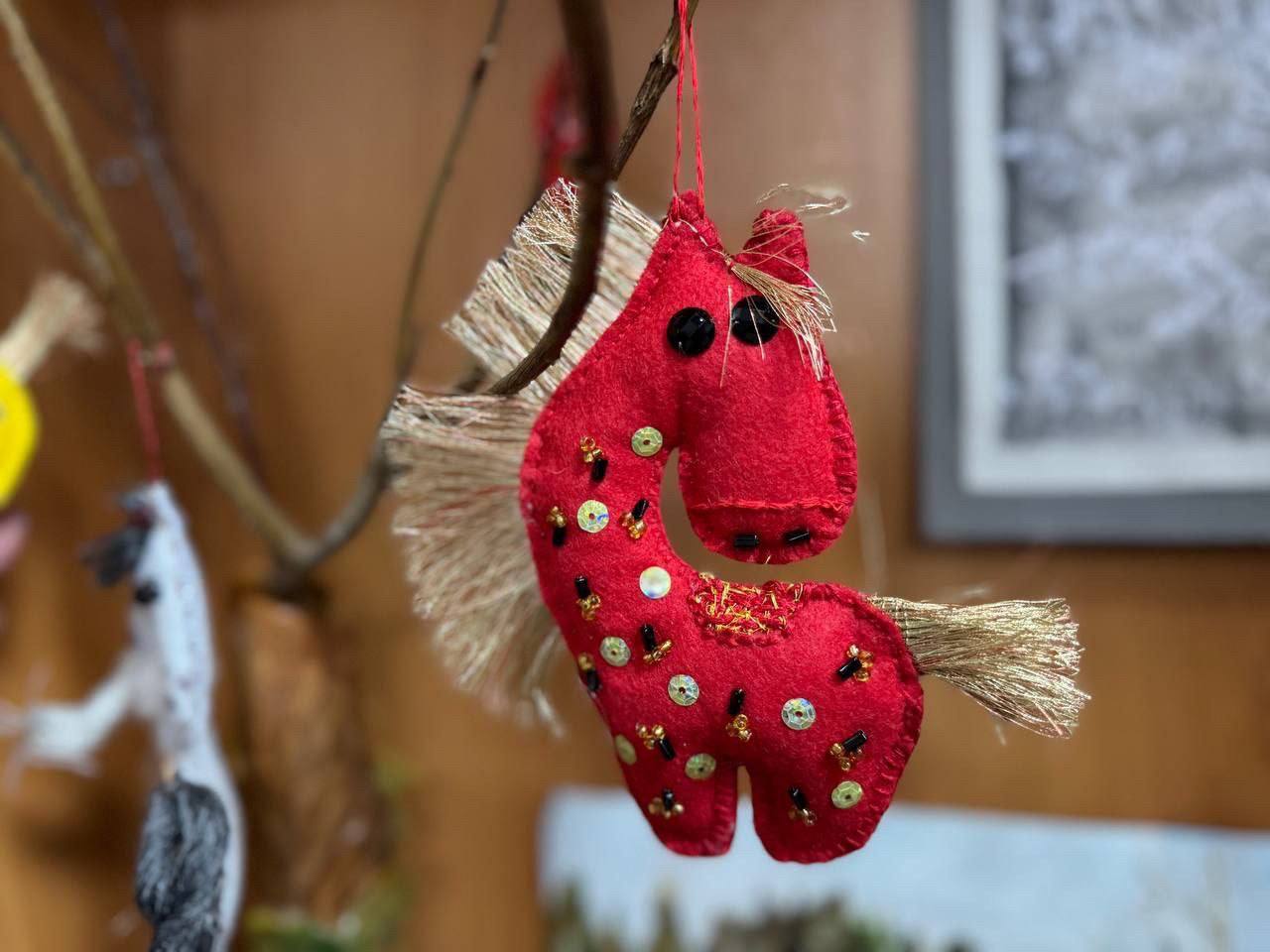 Настоящей звездой выставки стала подушка-символ наступающего 2026 года — огненная лошадь. Её создательница Ирина Афонченко поделилась простым, но гениальным способом изготовления: фигурка шьётся из двойной выкройки, а уши, хвост и грива добавляются из того же материала. Завершающий штрих — выразительные чёрные пуговицы вместо глаз.