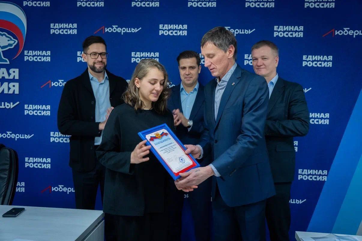 Благодарственные письма от имени главы г.о. Люберцы секретаря местного отделения партии «Единая Россия» Владимира Волкова вручили представителям бизнес-сообщества и ученице 9 класса Яне Домогацкой.