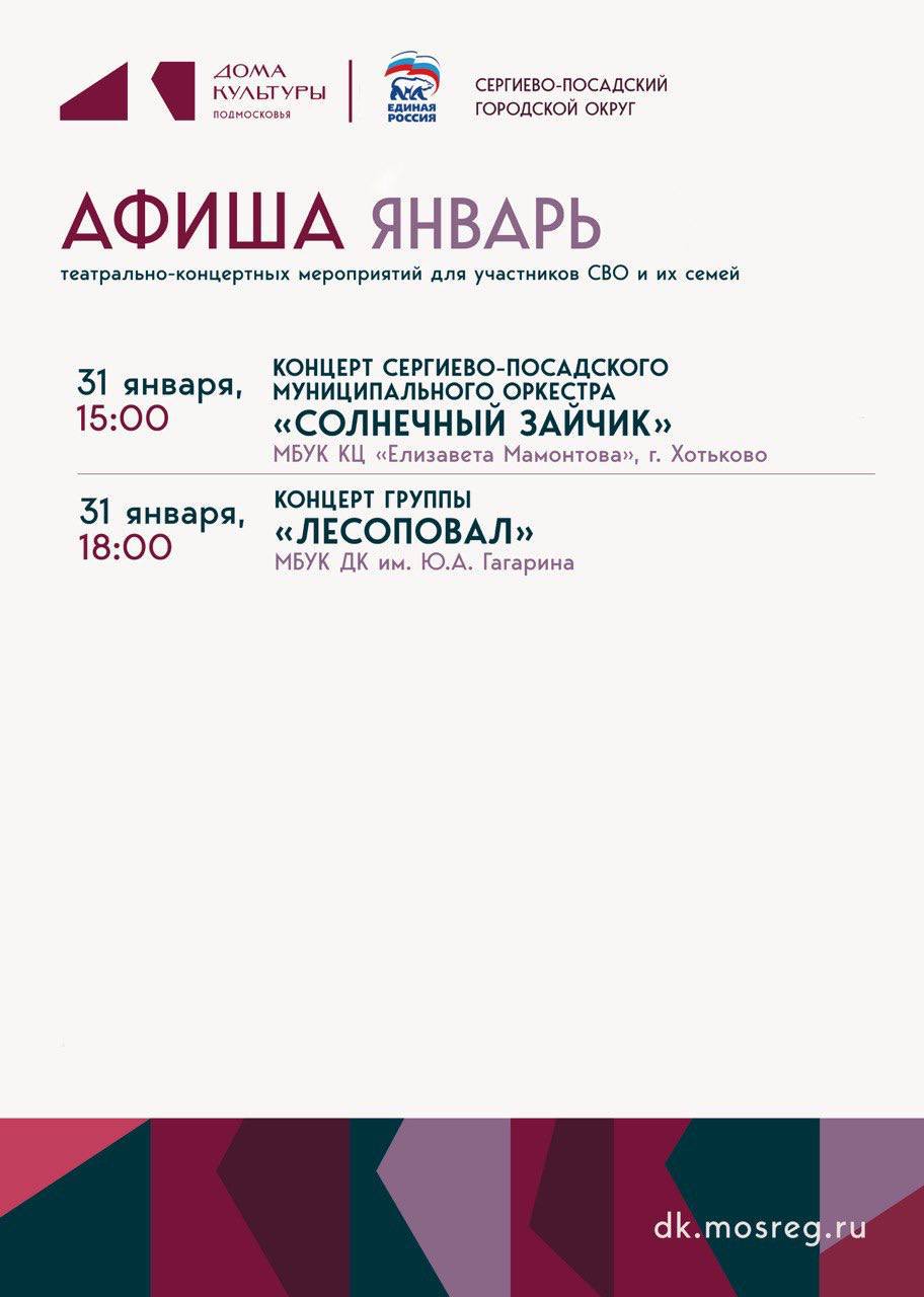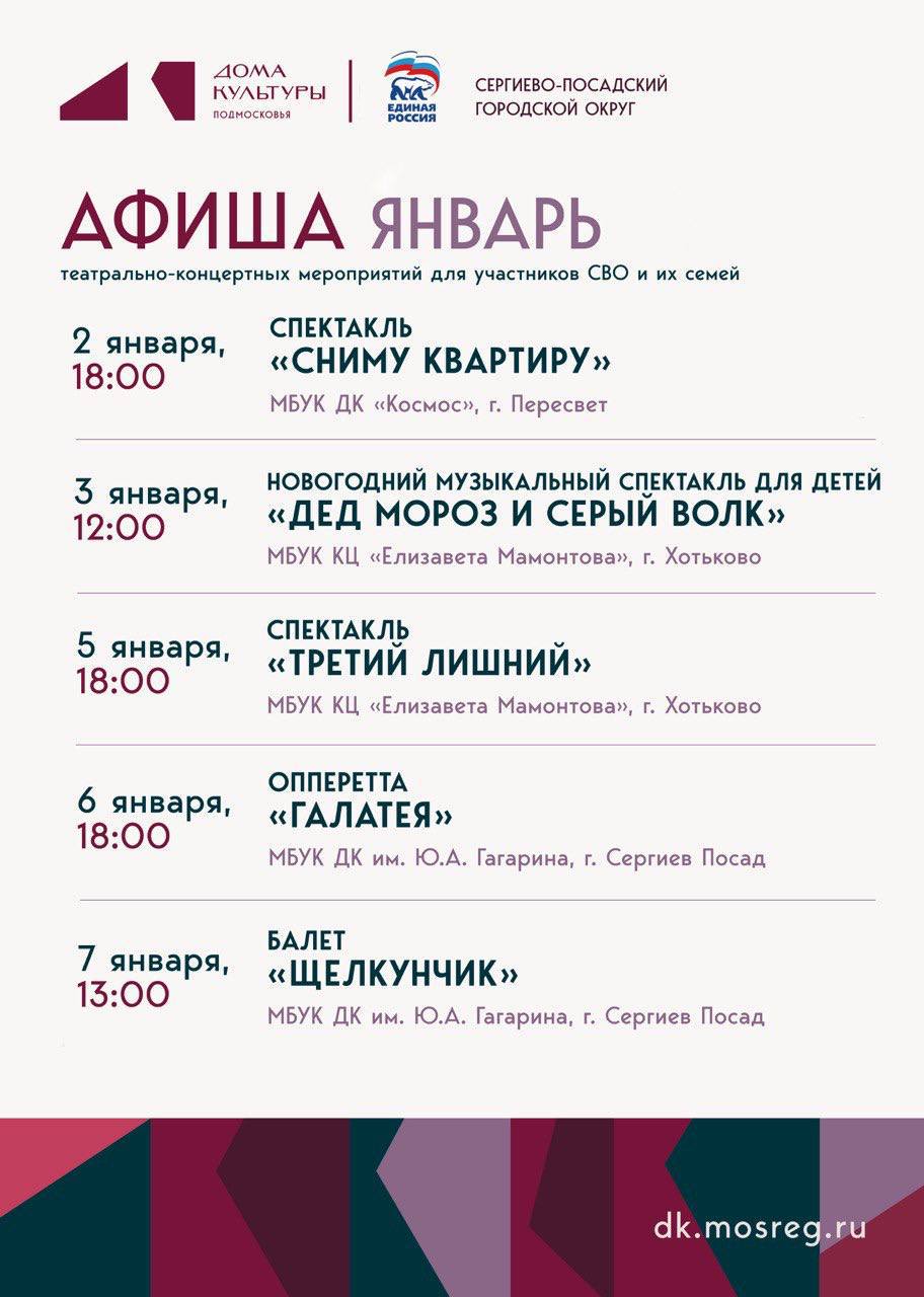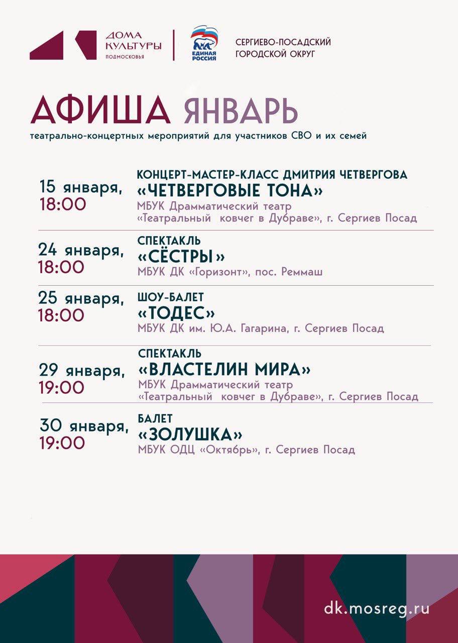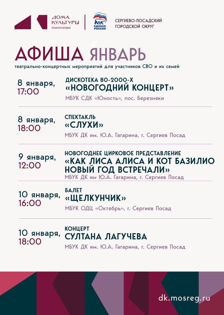 Культурно-досуговые учреждения Сергиево-Посадского округа и партия «Единая Россия» приглашают жителей на театрально-концертные мероприятия, которые пройдут в январе
