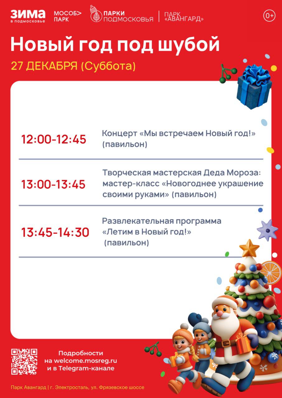 13:00–13:45 — творческая мастерская Деда Мороза: мастер-класс «Новогоднее украшение своими руками» (в павильоне для мастер-классов)