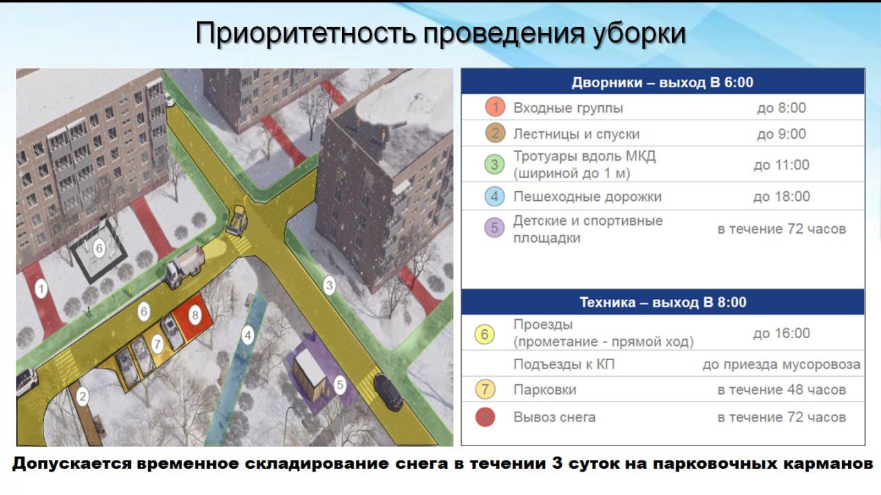 По нормативам уборка снега должна проводиться в течение 8 часов после снегопада, вывоз - в течение 5 суток. В первую очередь очищаются подходы к домам, входные группы и опасные участки, затем - тротуары, дорожки, парковки и площадки.