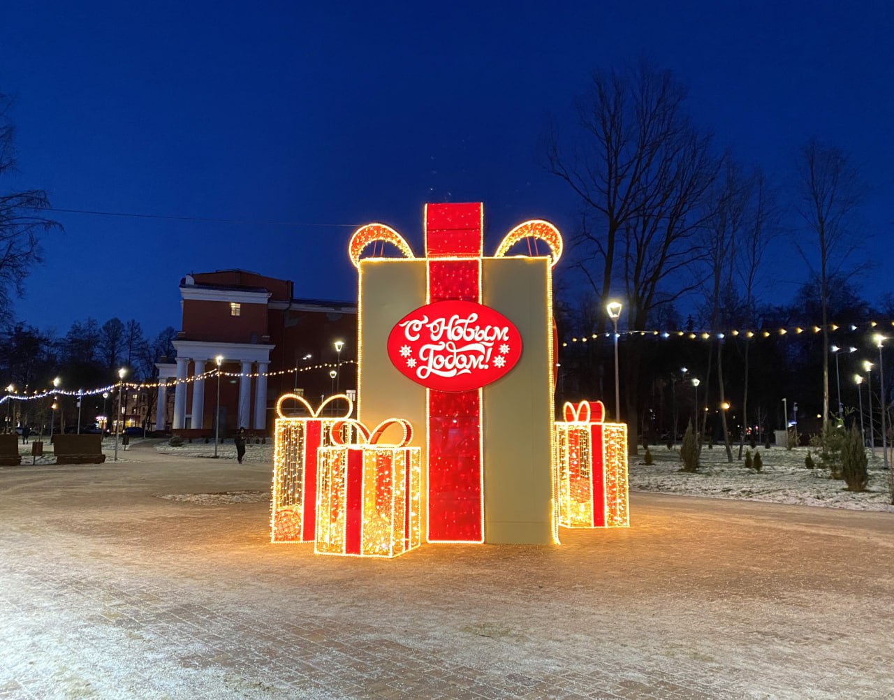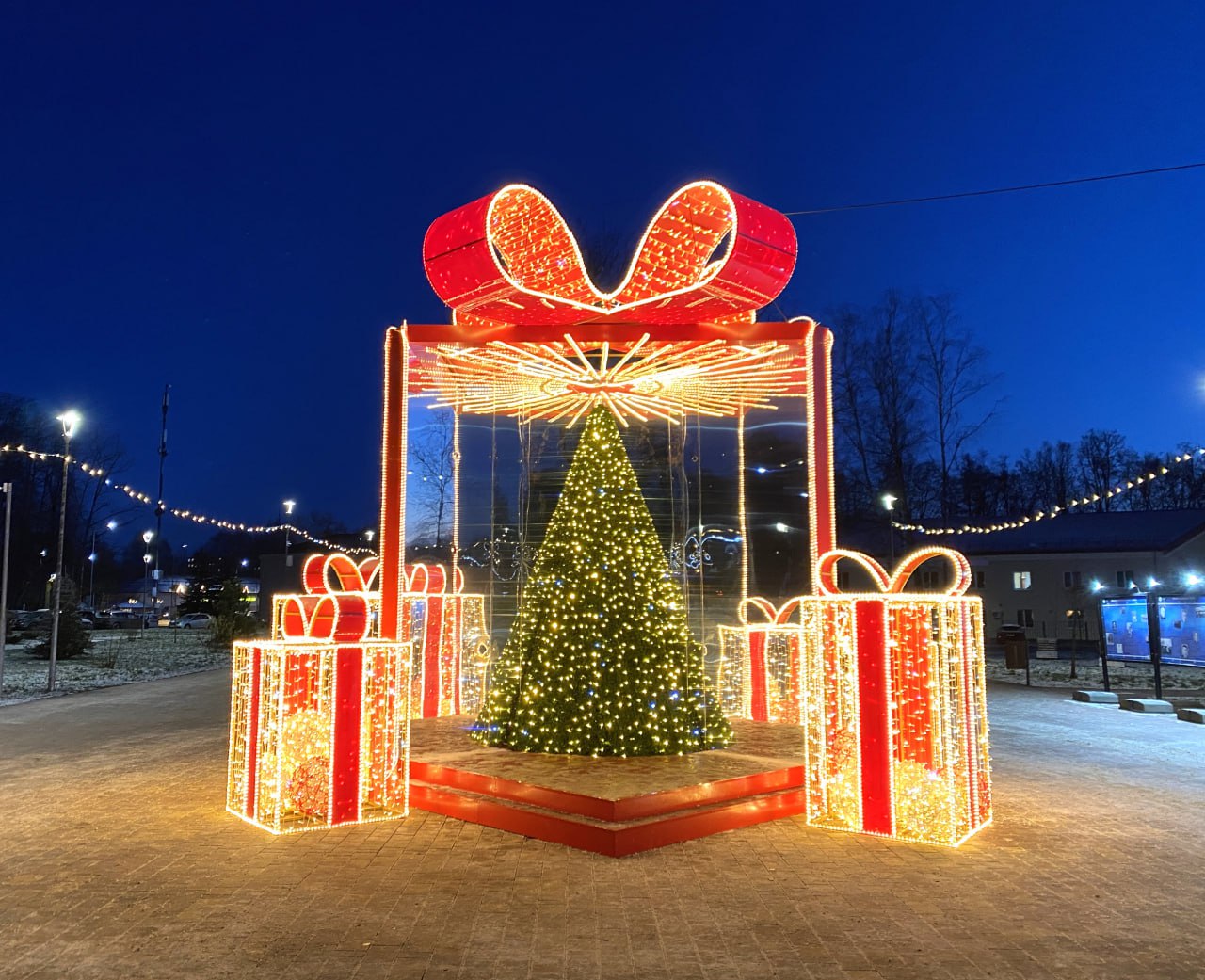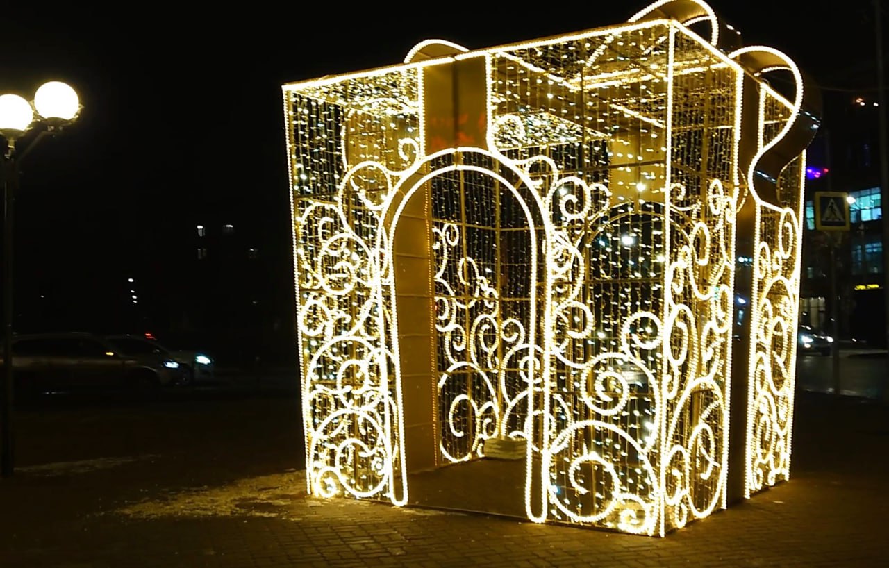 В центре парка «Восточный» возвышается яркая новогодняя инсталляция в виде большого подарка с ёлкой внутри.