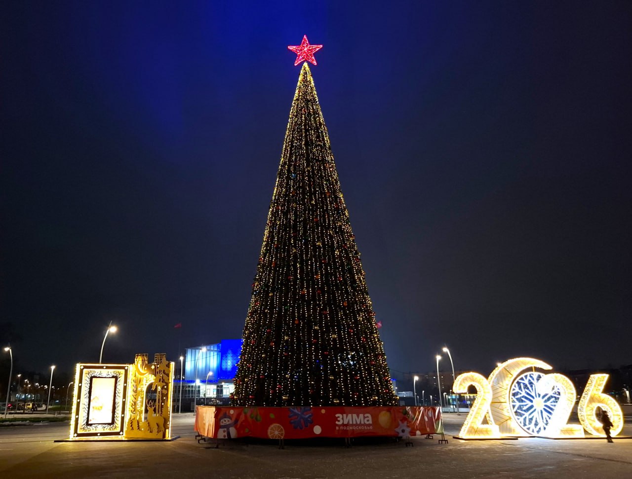 Полюбоваться ими и сделать фото на память можно на центральной площади города: помимо главной ёлки и большого ёлочного шара там установлена книга-открытка и светящиеся цифры наступающего года — 2026.
