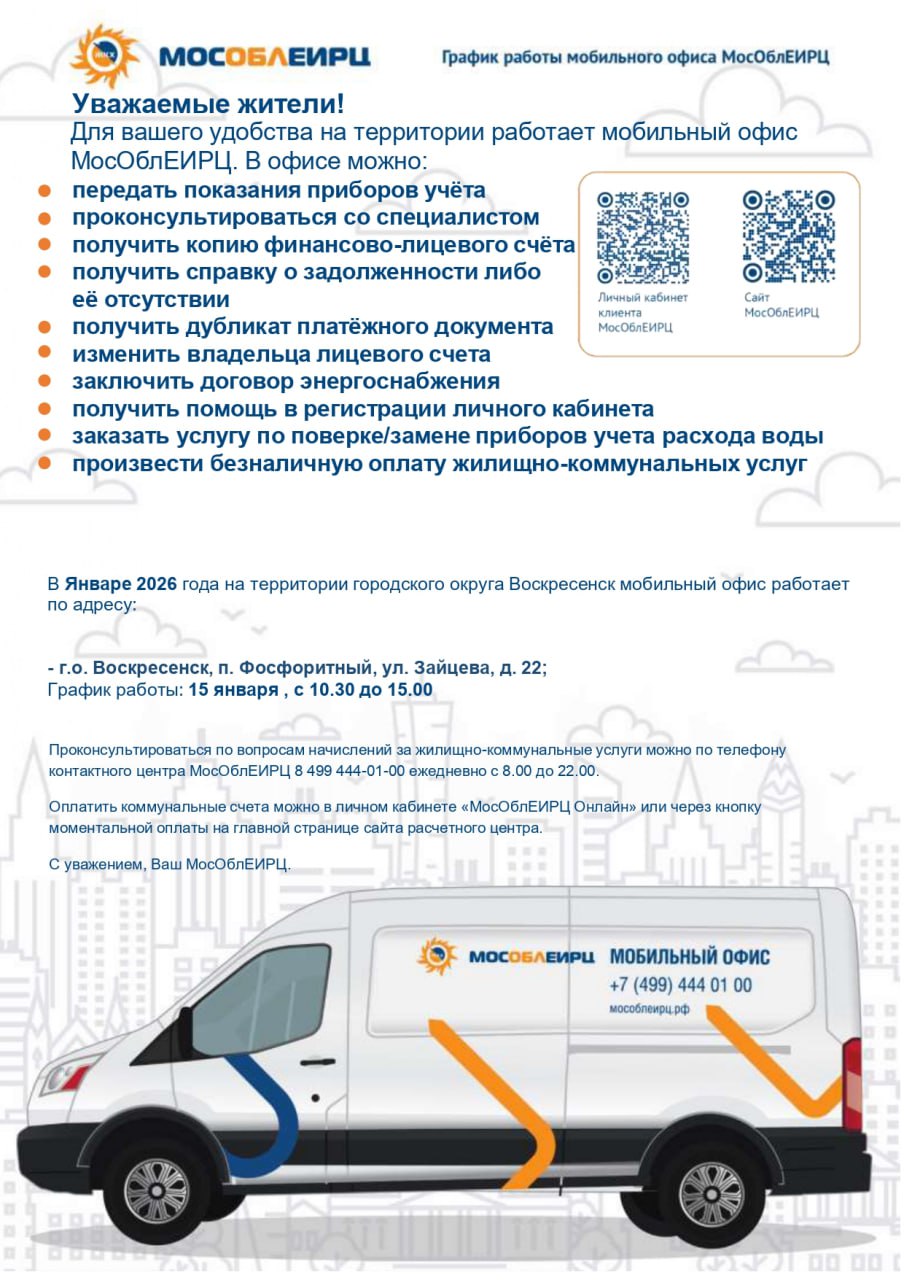 Информируем, что 15 января 2026 года для удобства жителей будет работать мобильный офис МосОблЕИРЦ по адресу: г. о. Воскресенск, п. Фосфоритный, ул. Зайцева, д. 22 с 10.30 до 15.00.