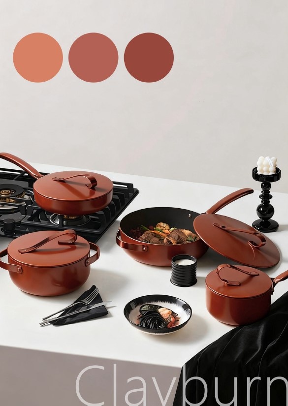 - Clayburn: Элегантный винтаж – этот глубокий терракотовый оттенок напоминает о тепле ремесленной работы и натуральных материалах. Кухонные принадлежности в этом цвете создают уютное пространство, которое объединяет ретро-шарм с современными чертами дизайна.