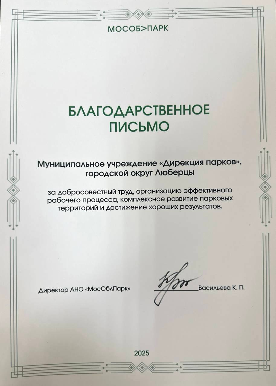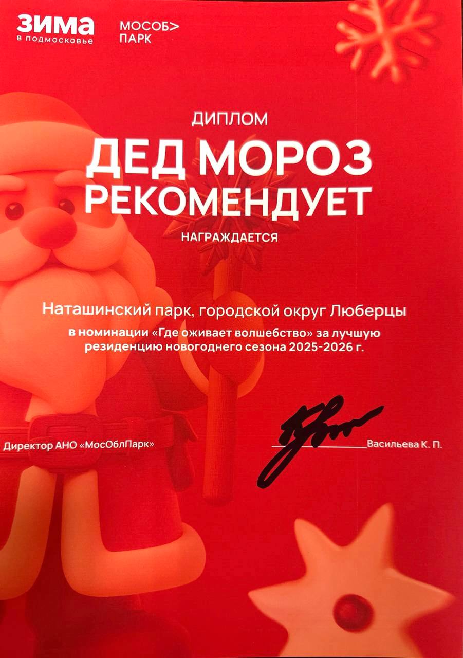 В номинации «Где оживает волшебство» за лучшую резиденцию Деда Мороза в новогоднем сезоне 2025-2026 гг. дипломом «Дед Мороз рекомендует» награжден Наташинский парк. Также Дирекции парков г.о. Люберцы вручили благодарственное письмо «За добросовестный труд, организацию эффективного рабочего процесса, комплексное развитие парковых территорий и достижение хороших результатов».