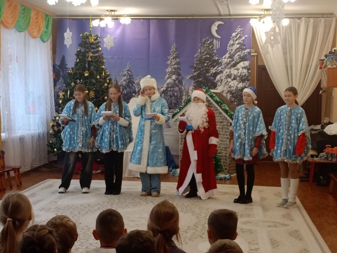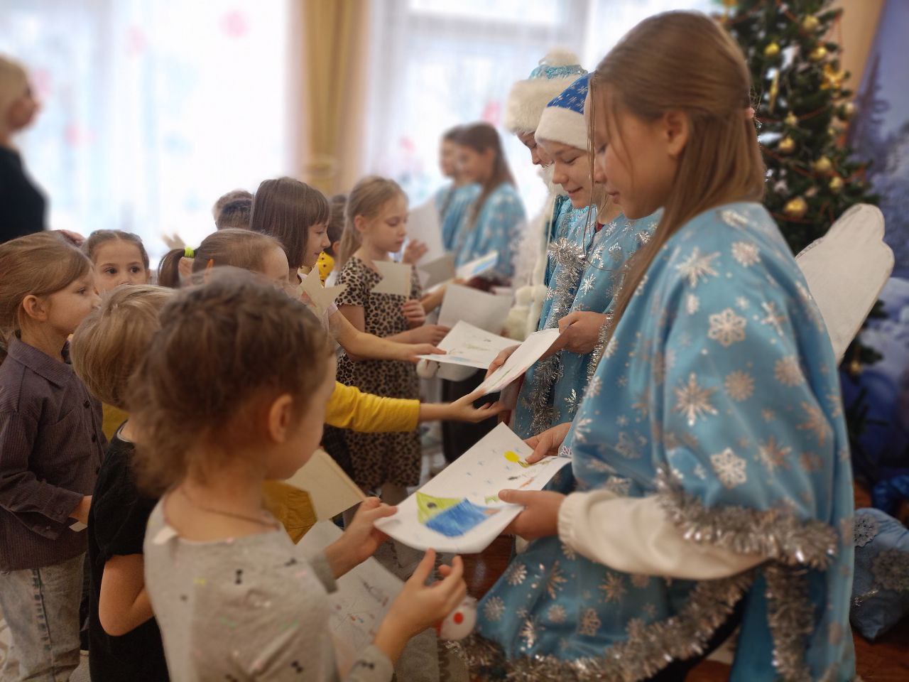 Маленькие зрители внимательно следили за представлением, участвовали в играх, отгадывали загадки и сделали ответный подарок - картины Нового года, которые они специально нарисовали для встречи с гимназистами.