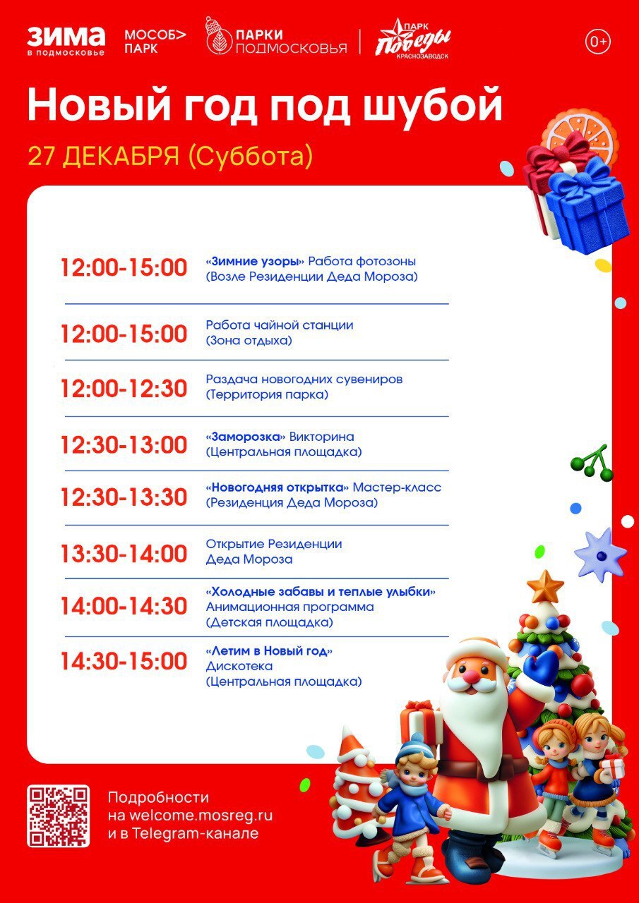 В парке Победы г. Краснозаводск будет работать фотозона «Зимние узоры», гостям раздадут новогодние сувениры, пройдут викторина, мастер-класс, открытие Резиденции Деда Мороза и анимационная программа «Холодные забавы и теплые улыбки».