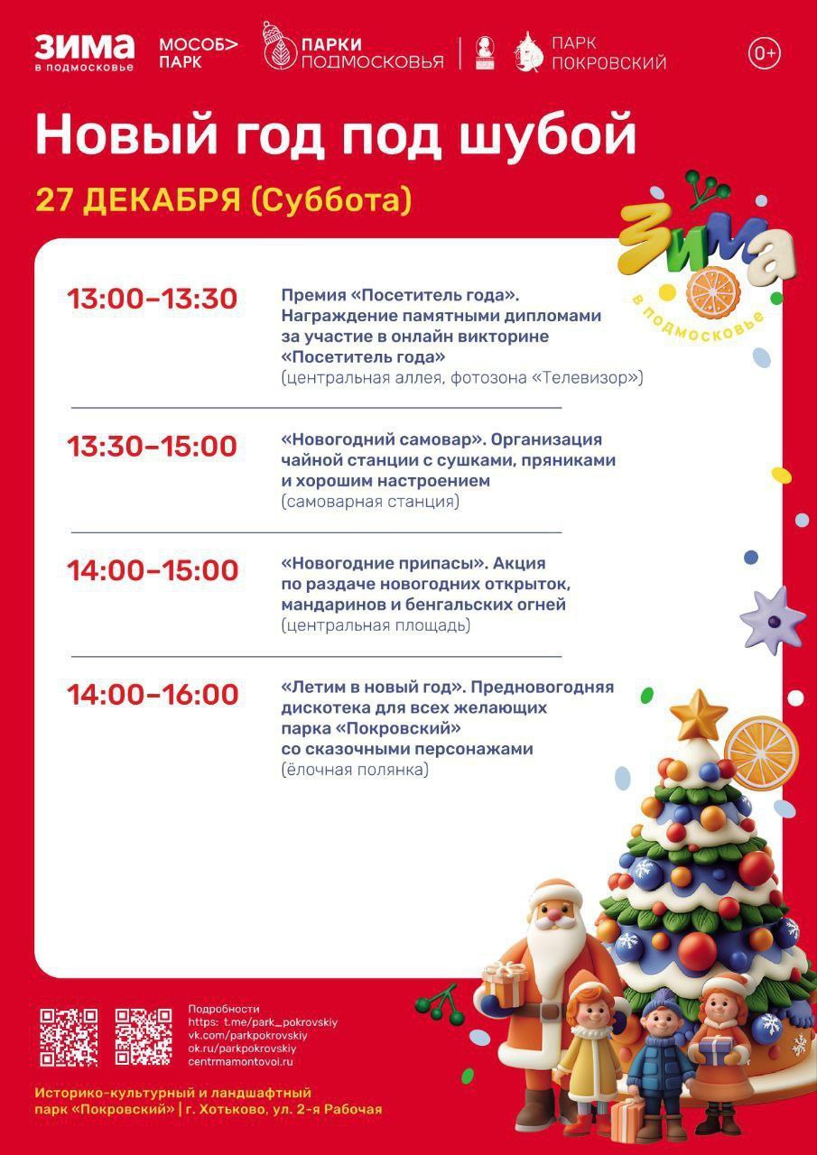 В парке «Покровский» г. Хотьково пройдет акция по раздаче новогодних открыток, мандаринов и бенгальских огней «Новогодние припасы», предновогодняя дискотека со сказочными персонажами «Летим в Новый год», а также все желающие смогут согреться теплым чаем на чайной станции.