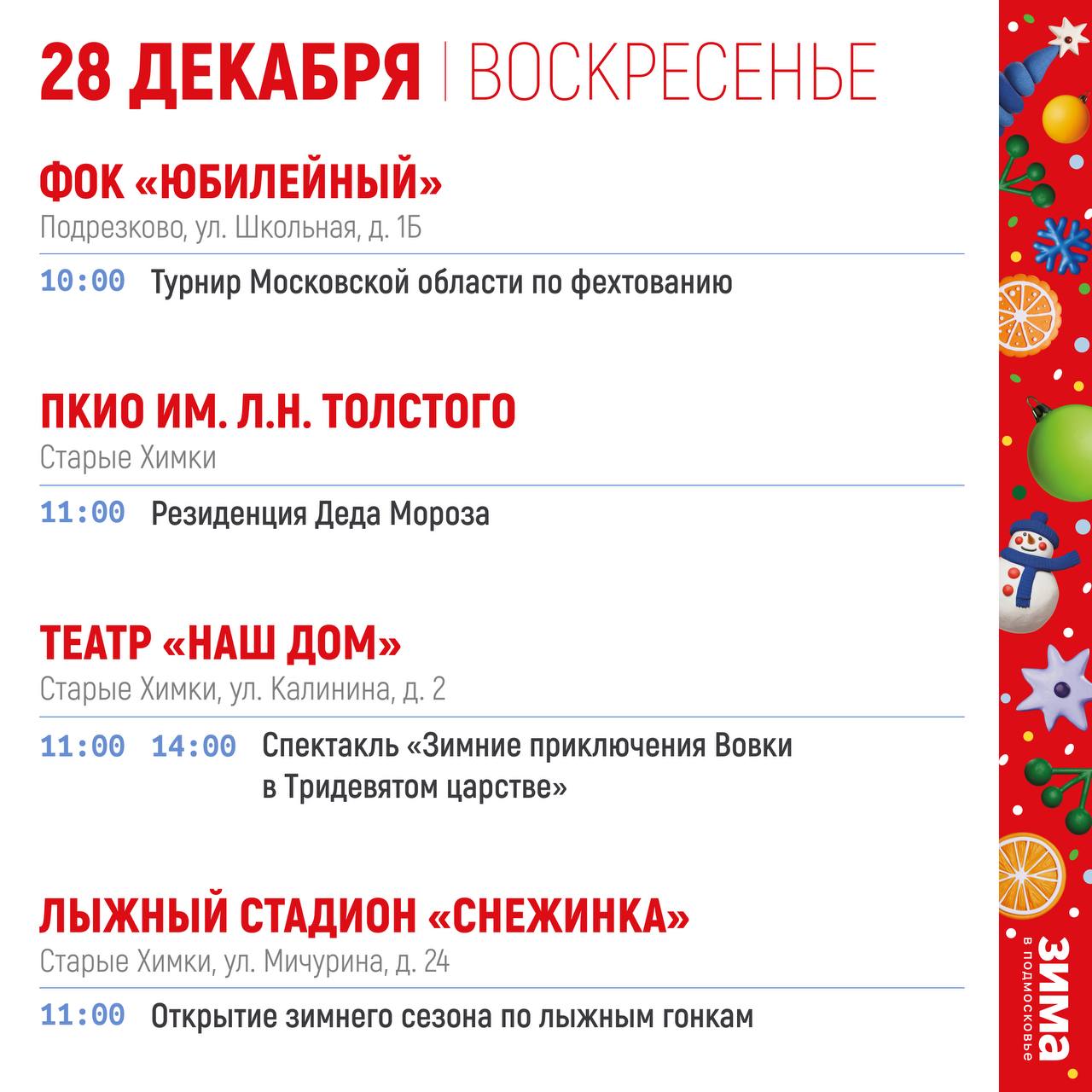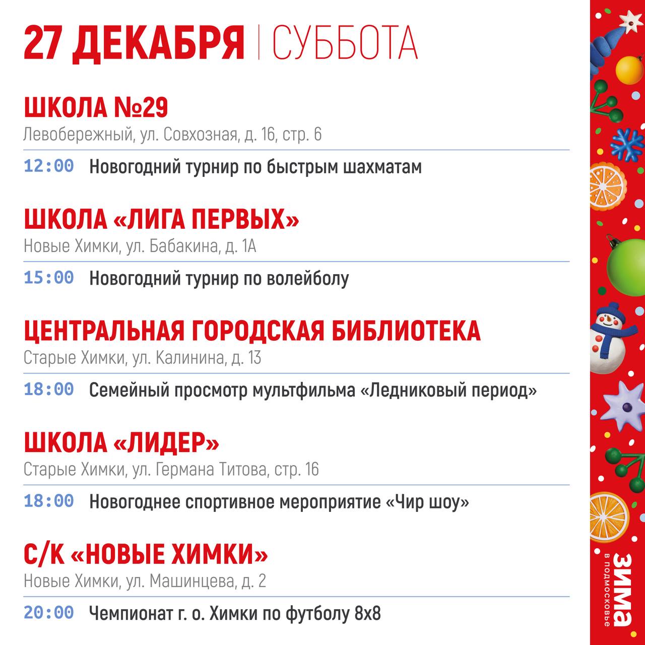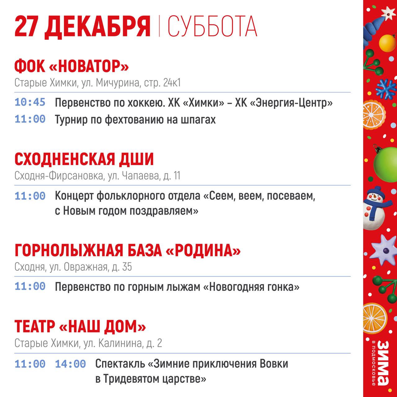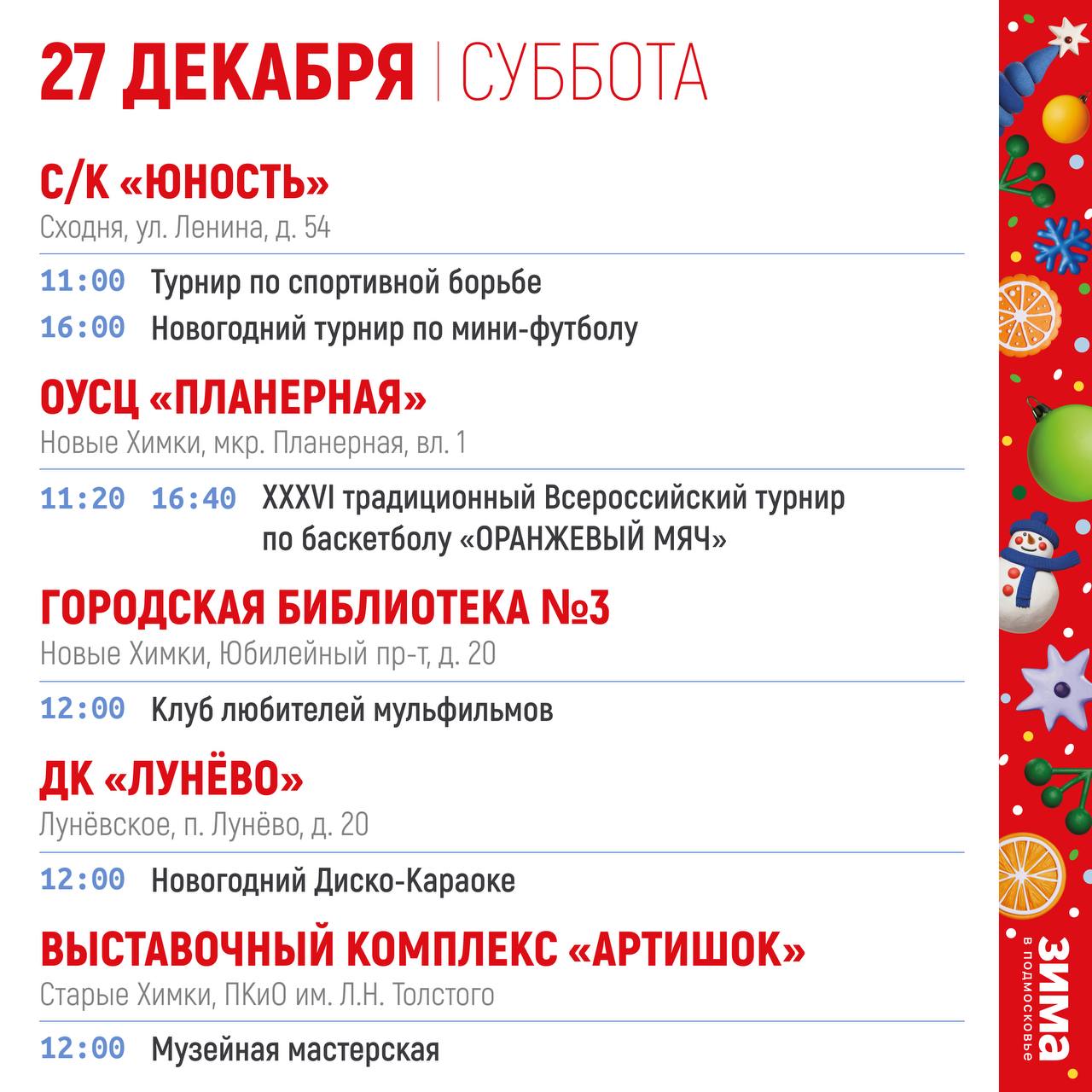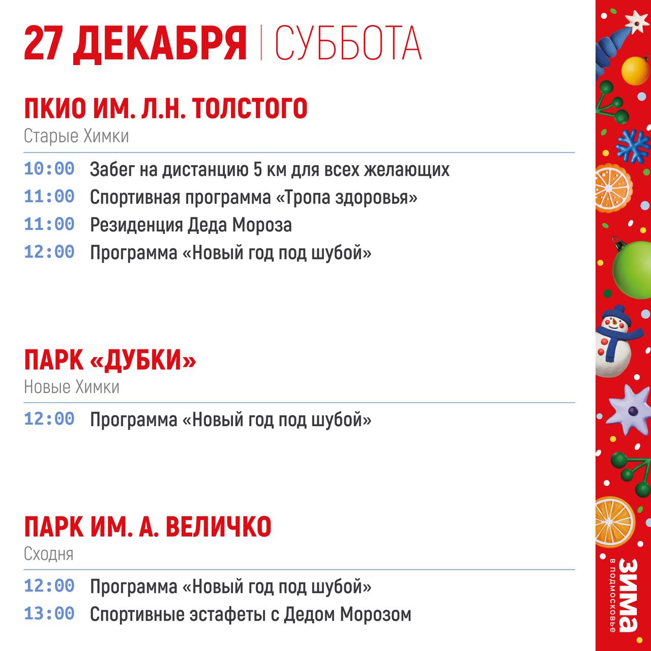 СУББОТА (27 декабря)Фестиваль: НОВЫЙ ГОД ПОД ШУБОЙ (0+)12:00 - 14:00 Городской парк культуры и отдыха г. ЧеховФестиваль: НОВЫЙ ГОД ПОД ШУБОЙ (0+)12:00 - 14:00 Парк «Дубки» с. ТроицкоеИгровая программа для детей (0+)12:00 - 12:40 Городской парк...