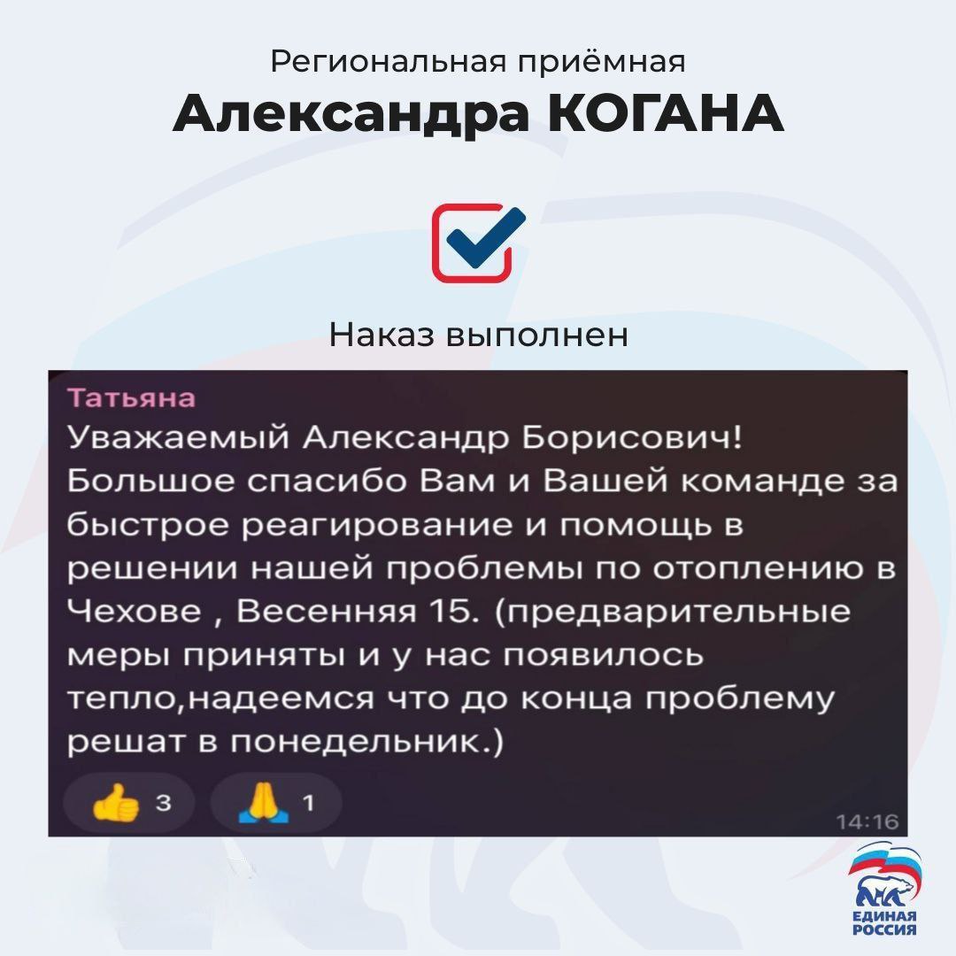 Команда региональной приемной совместно с администрацией м.о. Чехов и управляющей компанией решили вопрос: в тот же день на место выехала аварийная бригада. Специалисты справились всего за 3 часа — и тепло вернулось в квартиры.