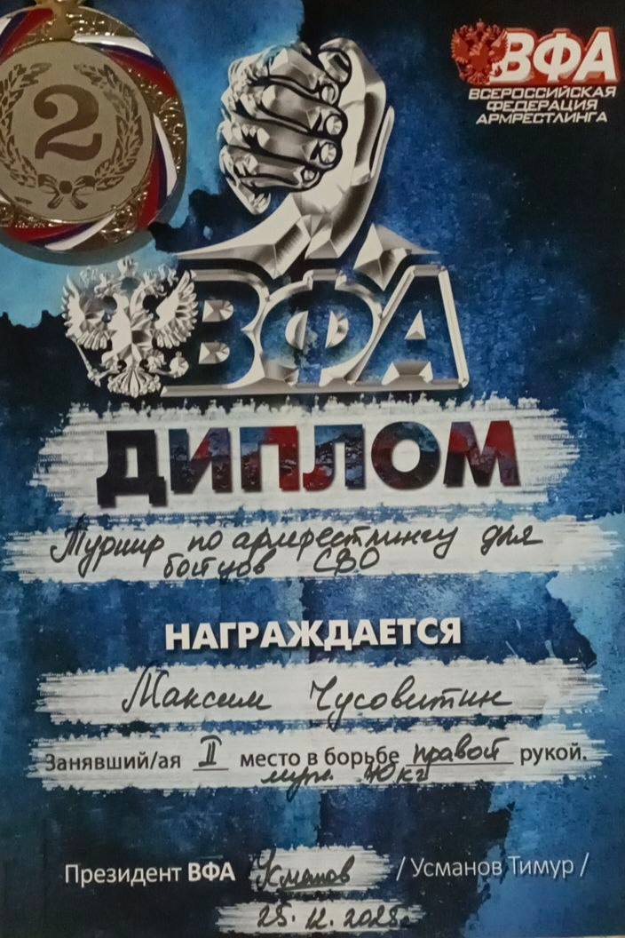 Член Люберецкого отделения Ассоциации ветеранов СВО Максим Чусовитин пополнил копилку наград серебряной медалью, заняв II место на турнире по армрестлингу.