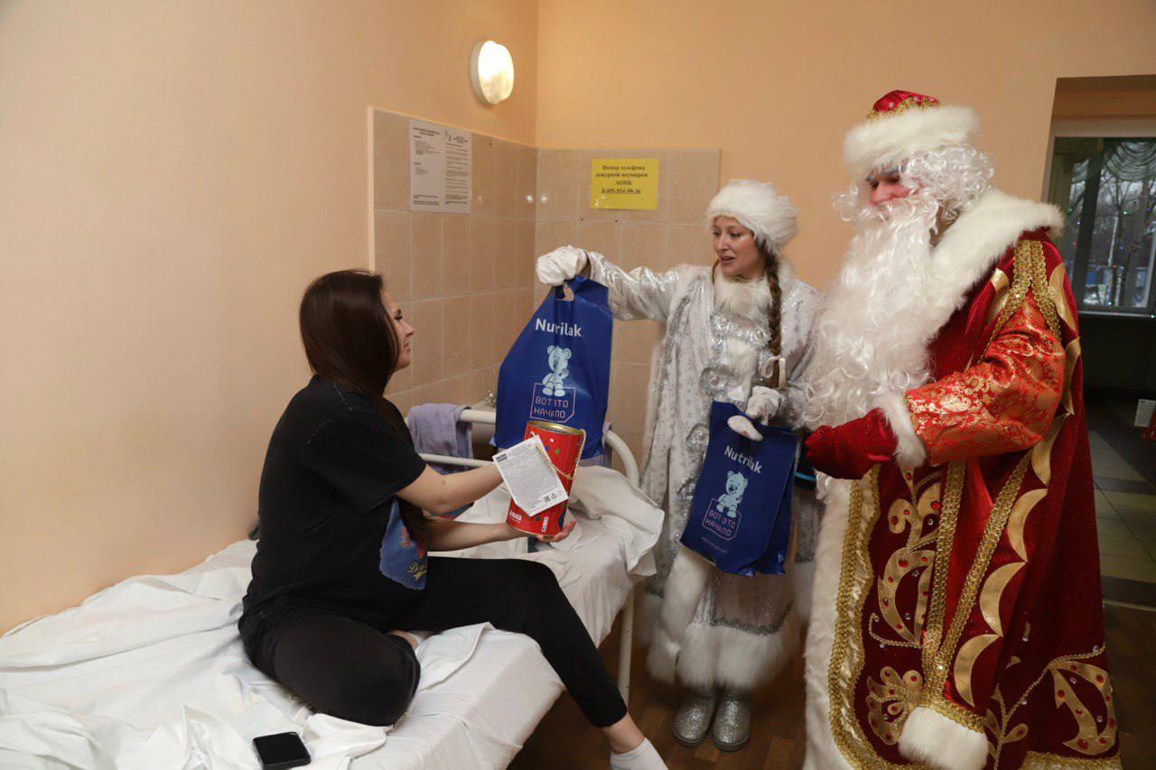 Сказочные персонажи лично поздравили беременных женщин и уже состоявшихся мам, пожелав им и их семьям крепкого здоровья, благополучия и счастливого материнства. В качестве подарков пациентки получили сладкие новогодние наборы, а также средства по уходу за младенцами и детские подгузники.
